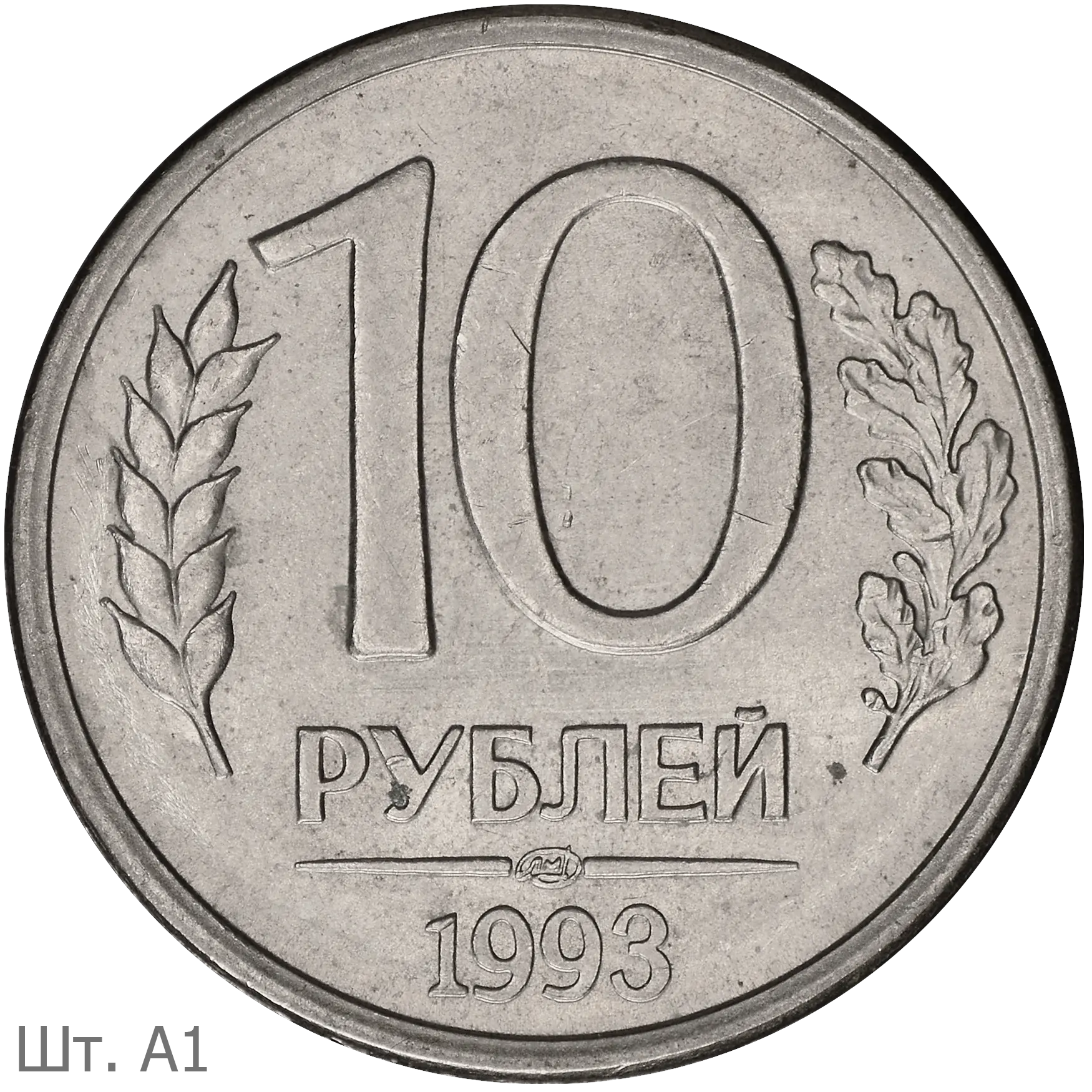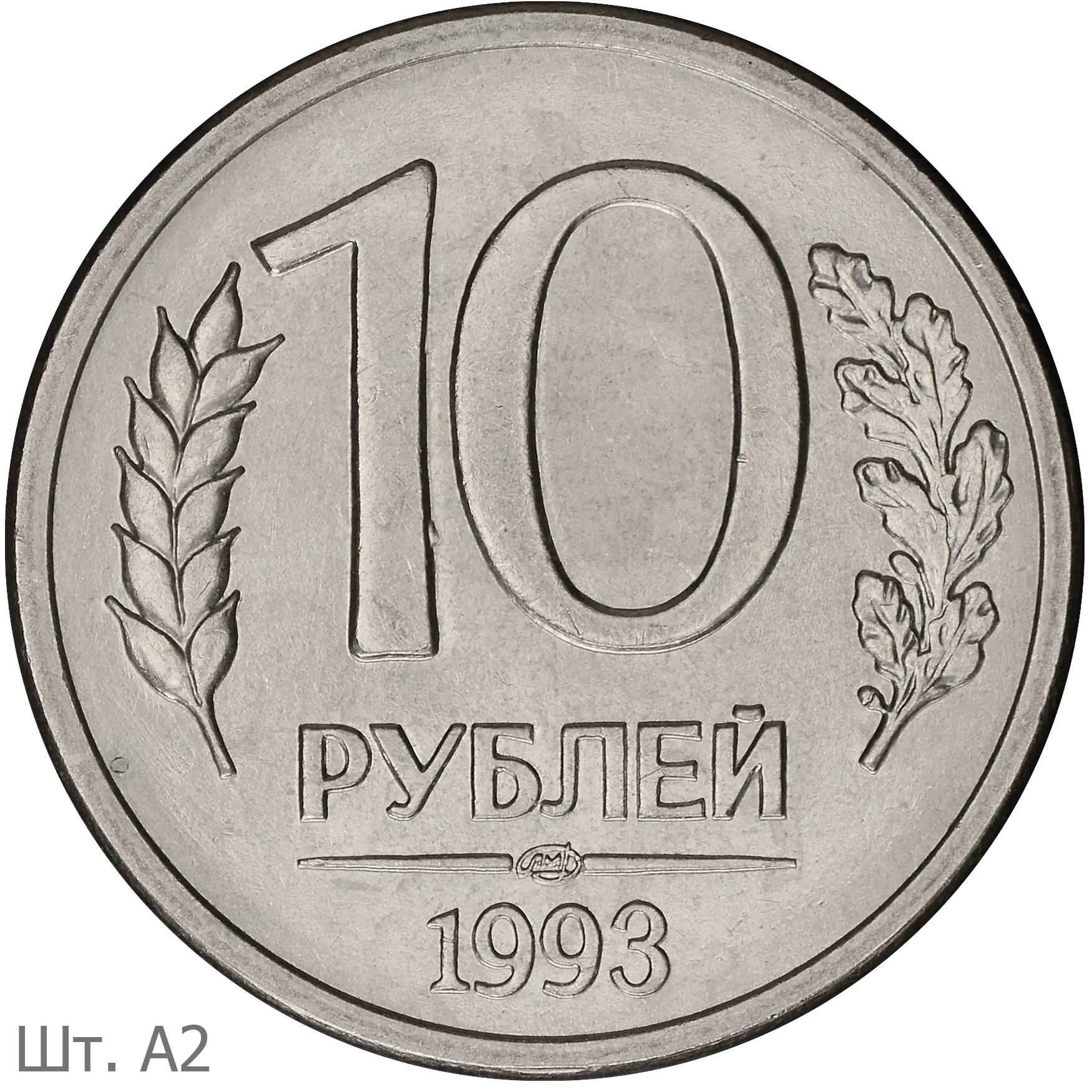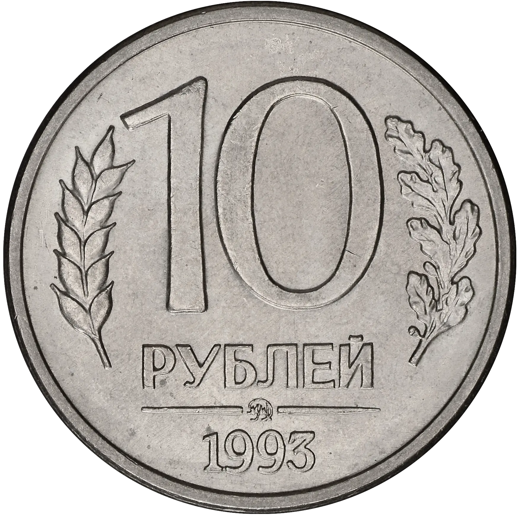 10 рублей 1993 ММД на медно-никелевой заготовке 1992 года (гурт гладкий).