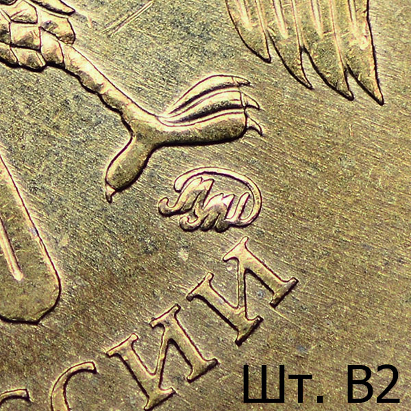 Штемпель В. Знак приподнят и смещён влево, повёрнут по часовой стрелке в сравнении со шт. А. Вплотную приближен к лапе орла.