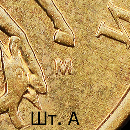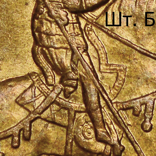 Примечание. Из-за износа в обороте и в зависимости от угла просмотра монет зачастую сложно сравнивать форму возвышающейся части окантовки. А разницу в размерах изображения сложно заметить глазом, поскольку расстояние от элементов изображения до канта у этих разновидностей почти одинаково. Устойчивый визуальный признак для сравнения - форма элемента между задней окантовкой чепрака и лукой седла. У шт. А элемент в верхней части обрывается прямым срезом, у шт. Б элемент плавно снижается к полю монеты, разделённый тремя боковыми линиями.