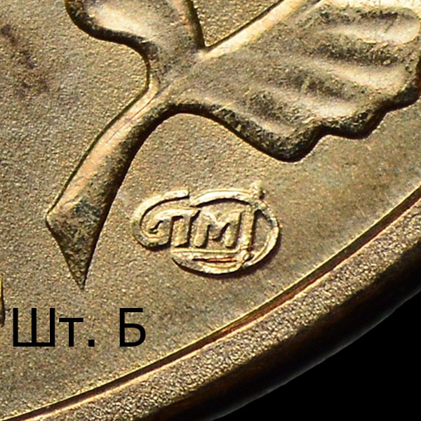 Штемпель Б. Знак приподнят и смещён вправо. Цифры даты сближены, размер изображения уменьшен (~ 1.5%) в сравнении со шт. А. Варианты аверсов показаны в мае 2022 Олегом Камыниным.