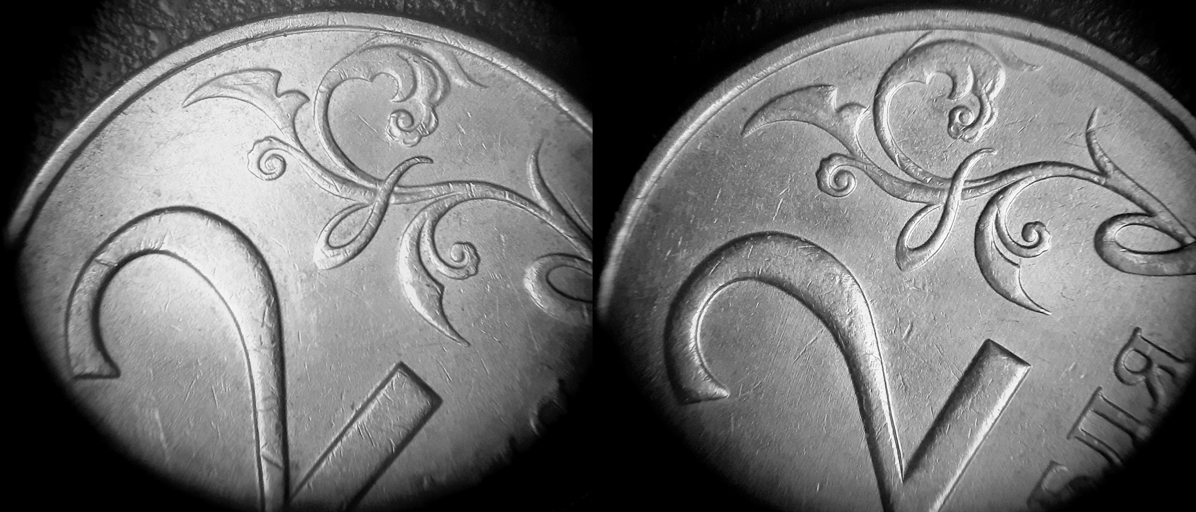 Добрый день форум. Посмотрите на вторую монету, по расположению минтмарки, шт. 2.3Б, а вот по изо реверса есть вопрос. На под шлифовку штемпеля не похоже, отличия, хоть фото и не айс, видно.