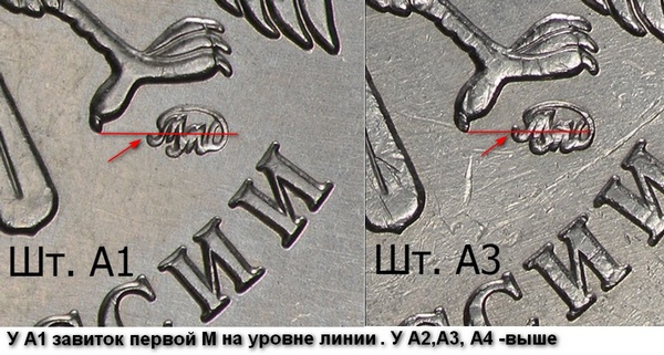У штампа А3 есть хорошо заметная фишка. В большинстве случаев даже на плохо сохранившейся монете можно её увидеть через 10 кратную лупу. Это две коротких параллельных чёрточки: