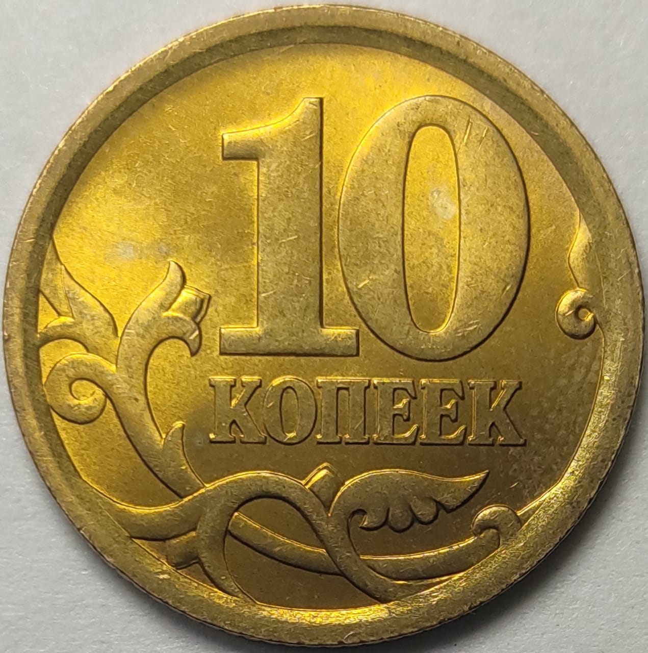 Как-то попался экземпляр 10 копеек 2005 СП с грубой шлифовкой, потом 1 копейка 1997 СП 1.12, сейчас попалась 10 копеек 2006 СП. Если есть другие года латунных 10 копеек с такой яркой выраженной шлифовкой, интересно было бы посмотреть.