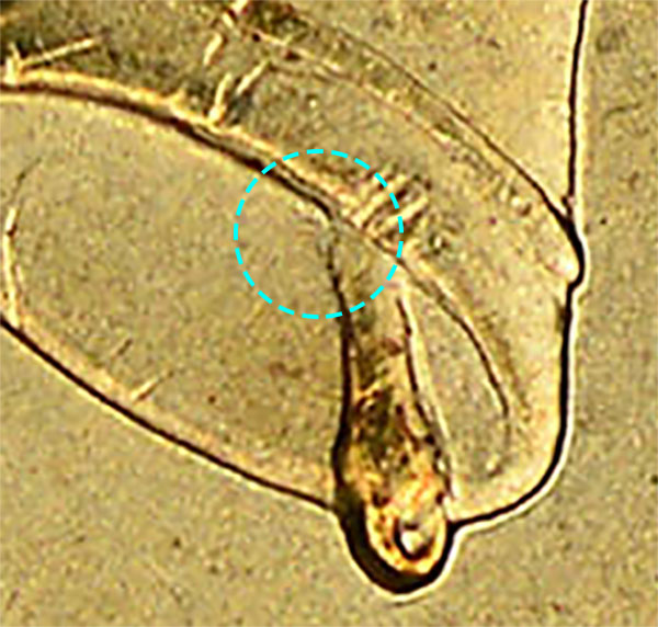 Ответ оказался банально прост, на монете каталога дефект, который стал виден при ОЧЕНЬ сильном увеличении.