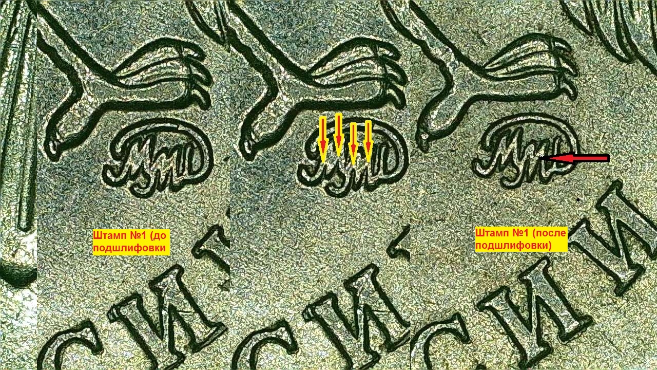 Посмотрел. Спасибо Андрей, но это не о том. Я имел в виду не шлифовку, а подшлифовку штемпеля после его длительного использования и износа. В этом случае меняются в размерах детали, как правило в сторону уменьшения и уплощения, но в данном случае, кроме смещения знака монетного двора, других отклонений не наблюдаю. В этом смысле мало опыта, потому и обратился к знающим.
