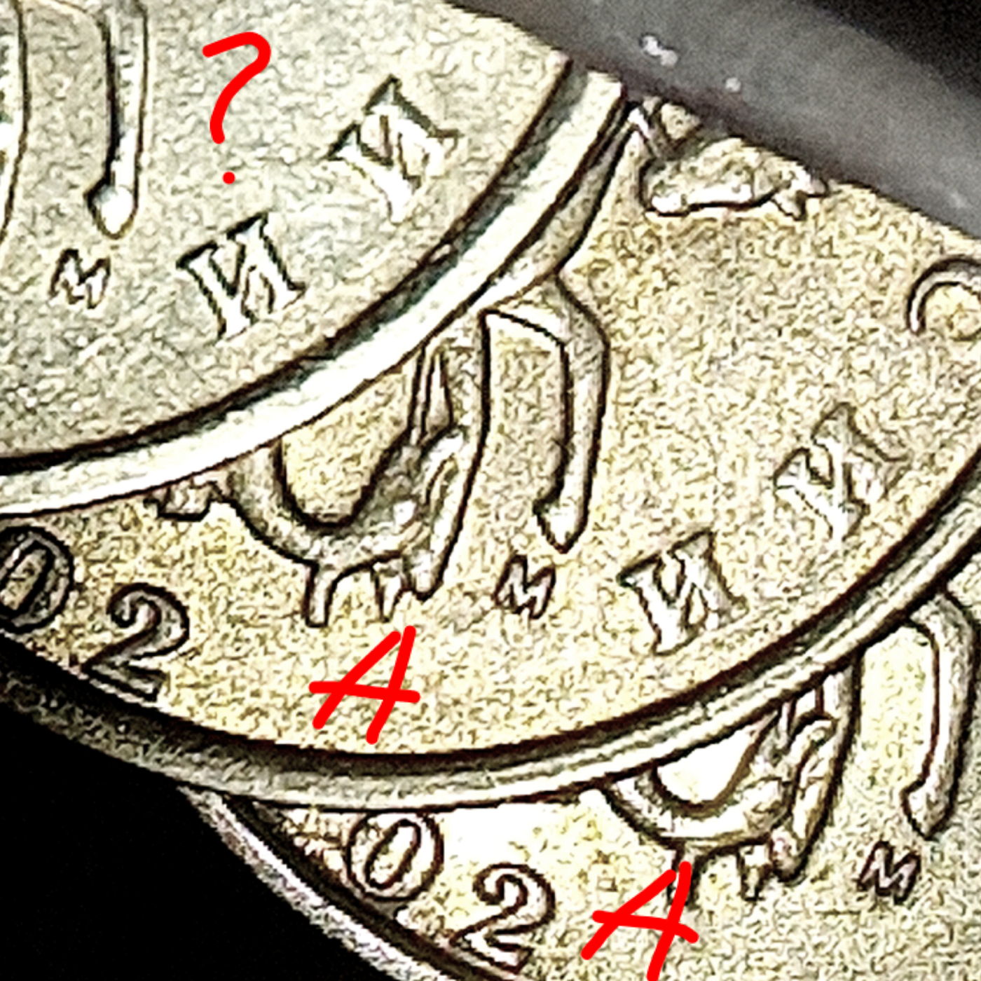 Александр, рельеф и ноги и минтмарки на вопросной монетке ниже. Предлагаю поразмышлять, как изменится видимое расстояние между контурами элементов, если сами элементы стали тоньше.