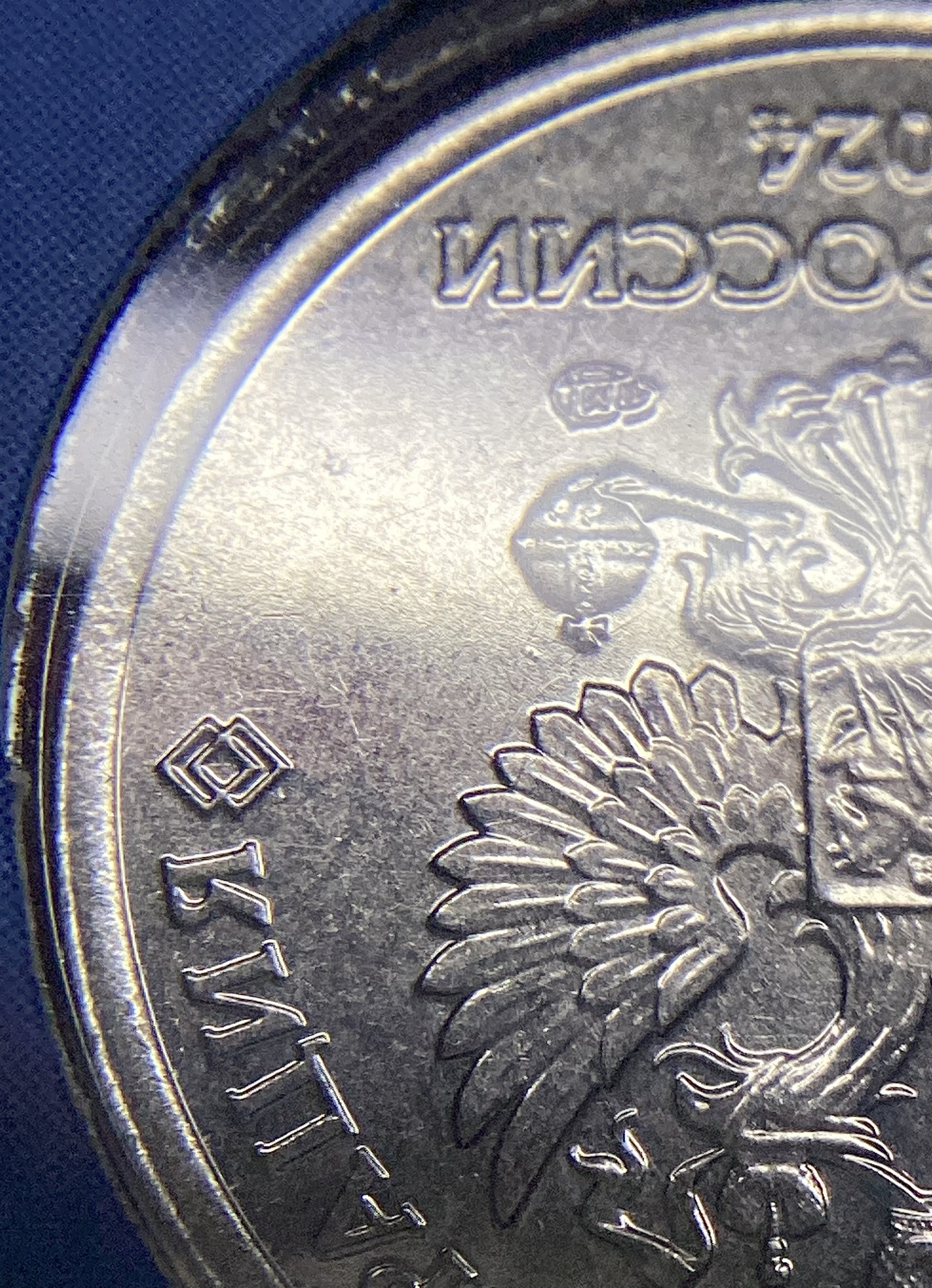 С приспущенными знаками еще хуже. Только 20% таких монет имеет относительно хороший прочекан этих листьев. Я выделил две шт.пары, которые легко различимы. И есть еще одна пара, но возможно она может еще разделиться, фишек на ней я не нашел, но общие следы износа одинаковы на всех монетах. Именно ее лучший оттиск я сфоткал. Но всё же прочекан у него хуже, чем у самой отборной монеты с приподнятым знаком.