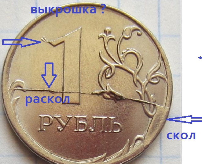 На этой монете 5 видов брака - 1раскол. 2 скол. 3 выкрошка. 4 износ штемпеля на буквах. 5 небольшой разворот реверс-аверс. Имеет ли такая монета интерес любителей или в оборот её?