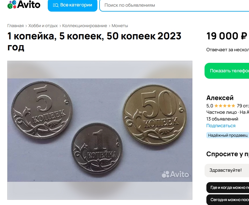 Сейчас цена на 1 копейку 400 руб, я вот думаю брать или не брать😁 Просто по ощущениям, как будто бы сейчас эти монеты просто хлынут на рынок и цена в результате дойдет рублей до 15