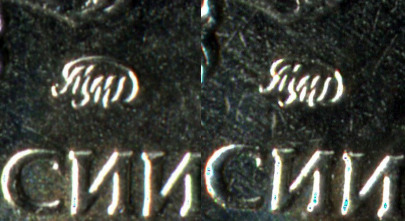 А фото аверсов хуже получаются, но в принципе вроде видно, что знак ММД другой формы, чуть увеличен, что хвостик второй буквы М касается первой, образуя узкую петлю (аверс А-?) и что хвостик второй буквы М касается первой, образуя широкую петлю (аверс Б-?).