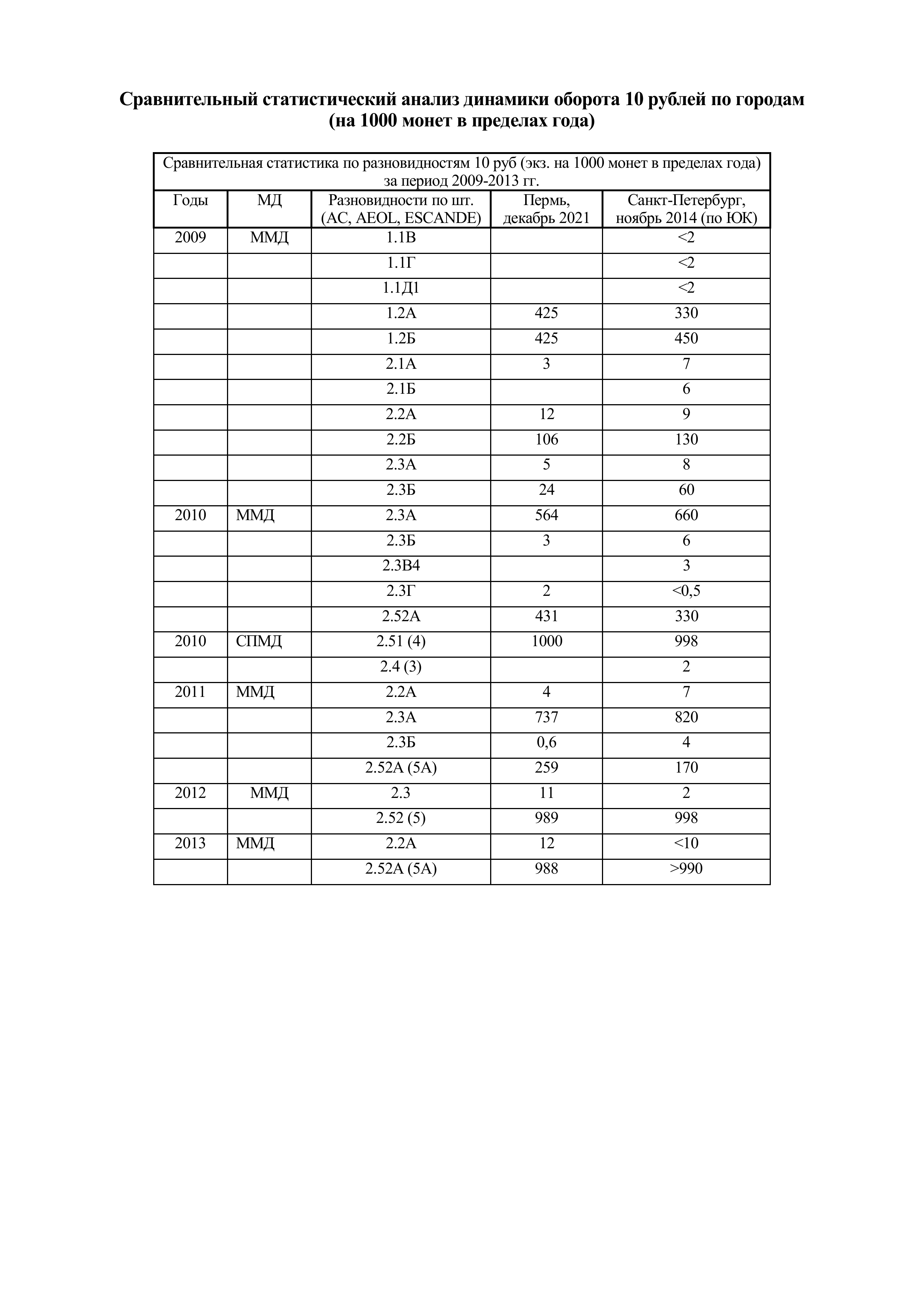 Таблица 3 Становится очевидным близкое сходство попадаемости 10 руб для Перми и СПБ в обороте 2009-2013 гг., что прослеживается как в массовых шт. (2009 ММД 1.2А, 1.2Б, 2.2Б; 2010ММД 2.3А, 2.52А; 2011 ММД 2.3А), так и в обычных, но встречающихся реже, например 2009 ММД 2.3Б. Этот факт, в известной мере, противоречит мнению о слишком большом и несравнимом индивидуальном разнообразии во встречаемости шт. по разным точкам. В своё время на разрозненных материалах удалось провести сравнение также по Казани с похожим результатом.