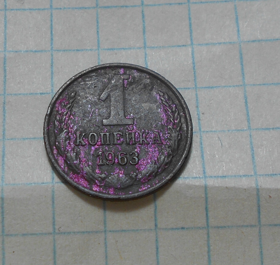 Добрый день . Копейка 1963 года,монетка почрневшая,но имеет цвет металла малиновый. Лупой близко смотрел это не так и не краска,а из под черноты такой цвет монеты,кто то может что то слышал про это? Или обязательно необходима спектральный анализ делать. Постарался фото получше сделать.