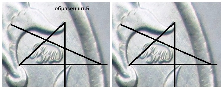 Это шт. А1. А на образце, подписанном как шт. Б, фото той же монетки. На правильном шт. Б знак расположен прямо. Прежде всего смотрите на размеры и степень подхода элементов к канту. У тиражного шт. А1 листья на 9-и часах разомкнуты, у рариков - нет.