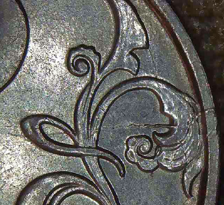 На аверсе - практически по всему кругу, череда параллельных канту расколов.