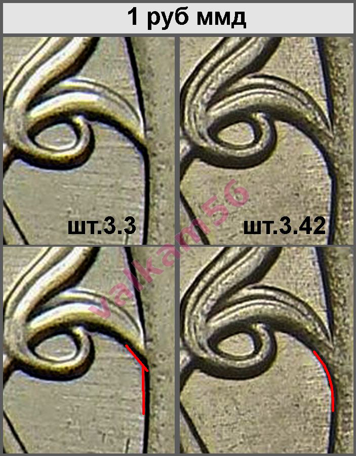 Во-первых, обозначение шт. 3.41 имеет силу исключительно в 2009. Это ранняя стадия копирования нового на тот момент тиражного штемпеля 3.42, запущенного в производство. Остальные штемпеля перепутать друг с другом невозможно. В случае, если из-за поганого качества чекана по листикам на 9 часах возникают сомнения, то достаточно посмотреть подход к канту нижнего листика на 3-х часах. На шт. 3.3 он образует угол в районе стыка с кантом, а на 3.42 полого образует полукруг.