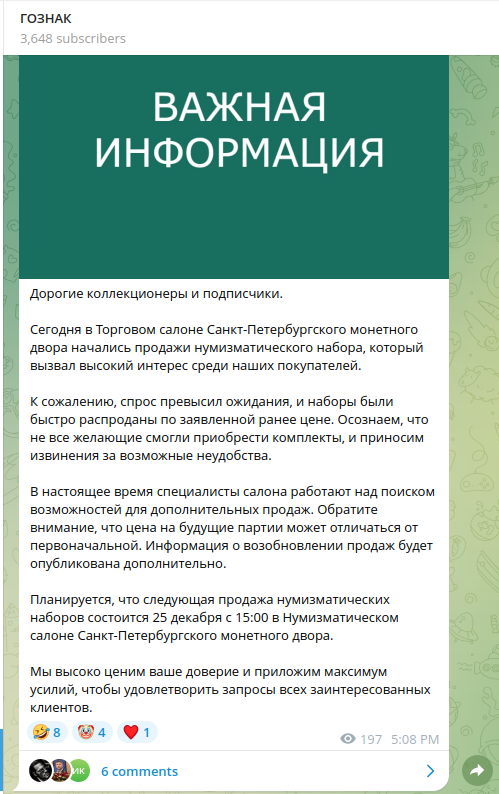 Ну как поговаривают. Я пришел где-то за час. Уже была очередь в районе 50 человек, к 15 часам было по ощущениям человек сто. Пока стояли, из салона потихоньку выходили гознаковцы с наборами. Но небыло такого чтобы брали прям сотнями штук. Обычная продажа своим до общего старта. Примерно минут за 10 до 15:00 вышел представитель салона, и объявил, что по указанию генерального директора продаж не будет. Будут завтра, стоимость 4000. На вопрос по сколько продавали своим, честно ответил что по 2000. Дальше музей разместил такое объявление, а пресслужба такое.