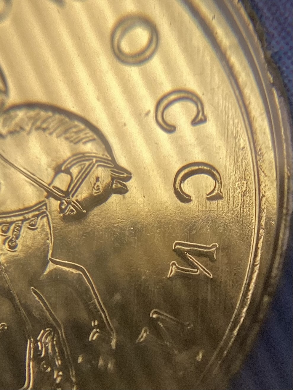 На аверсе ряд мелких линий (фишек) в районе букв СС в слове РОССИИ. И небольшой, но заметный штришок под левой задней ногой лошади.