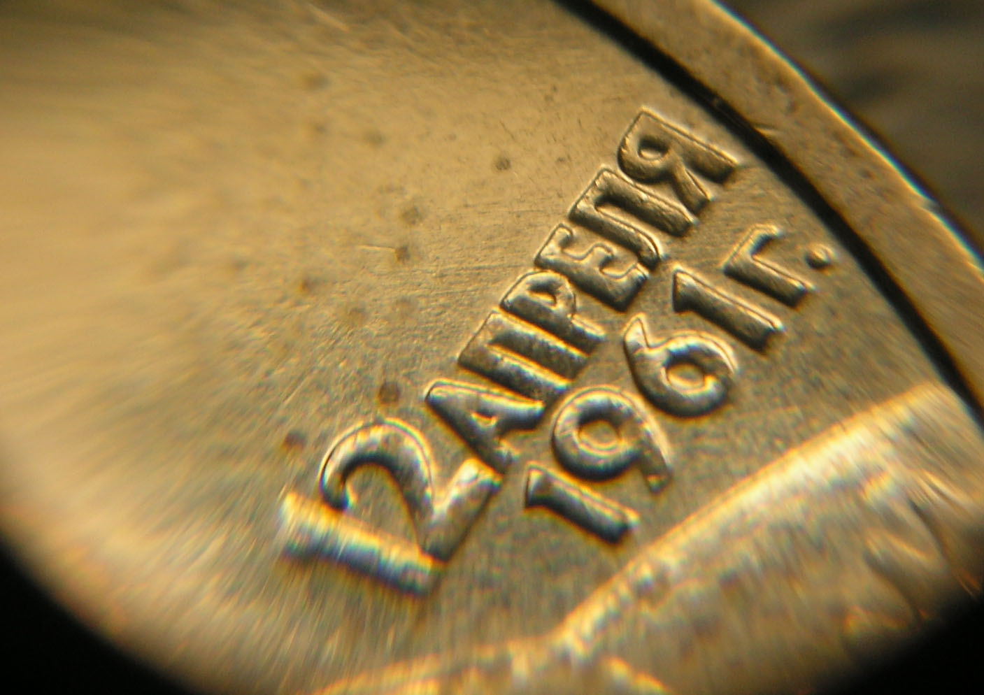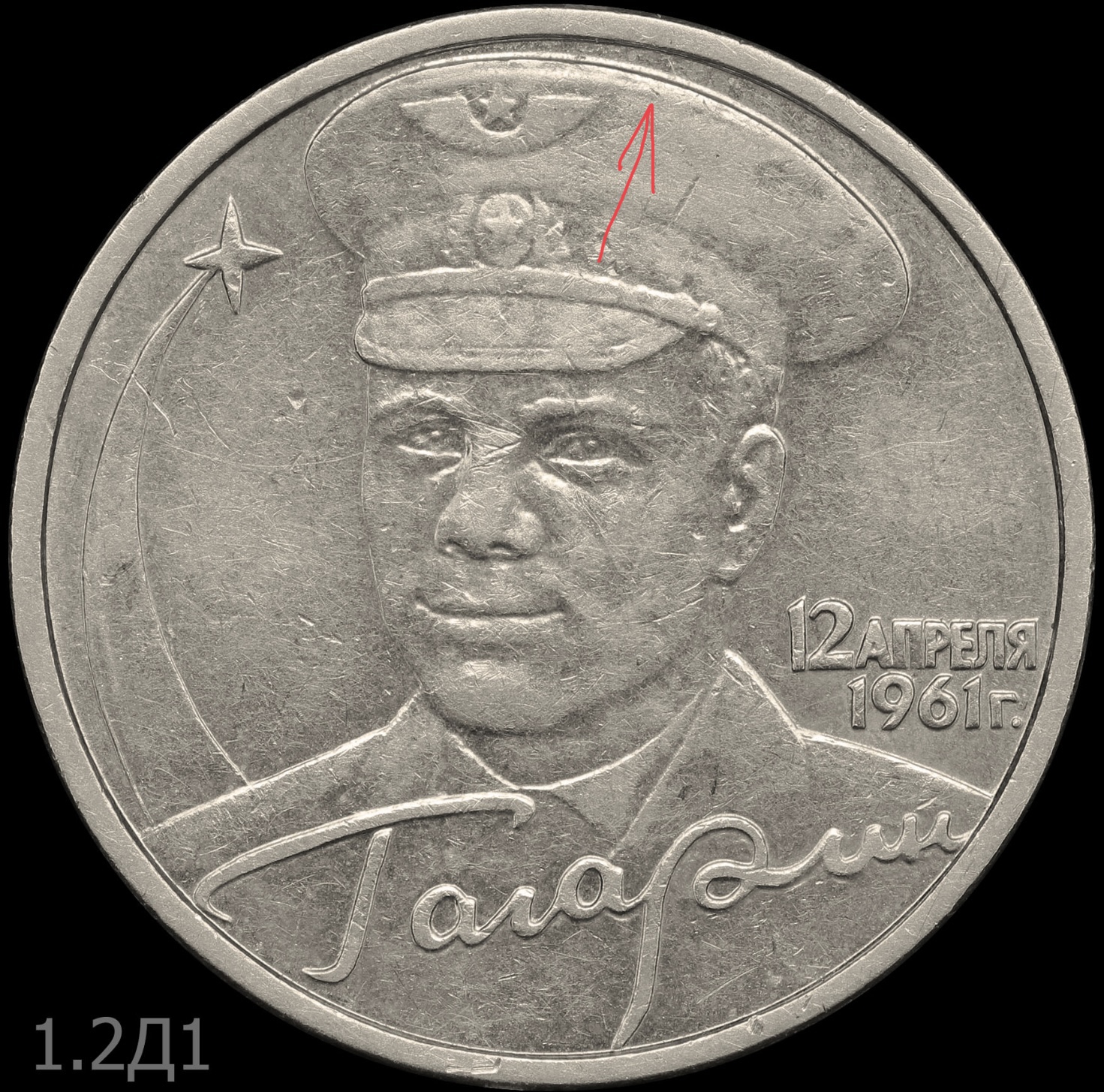И пришел уставший Д1. У него маленький раскольчик между кантом и фуражкой на 12:30. Он виден и на фото в каталоге. Подобный раскольчик бывает и у Г1, но не у всех, и мне кажется, что это штемпели всё-таки разные - общих линий не нашел. Зато нашел одну небольшую линию слегка под углом подходящую к канту после точки в надписи "1961г."