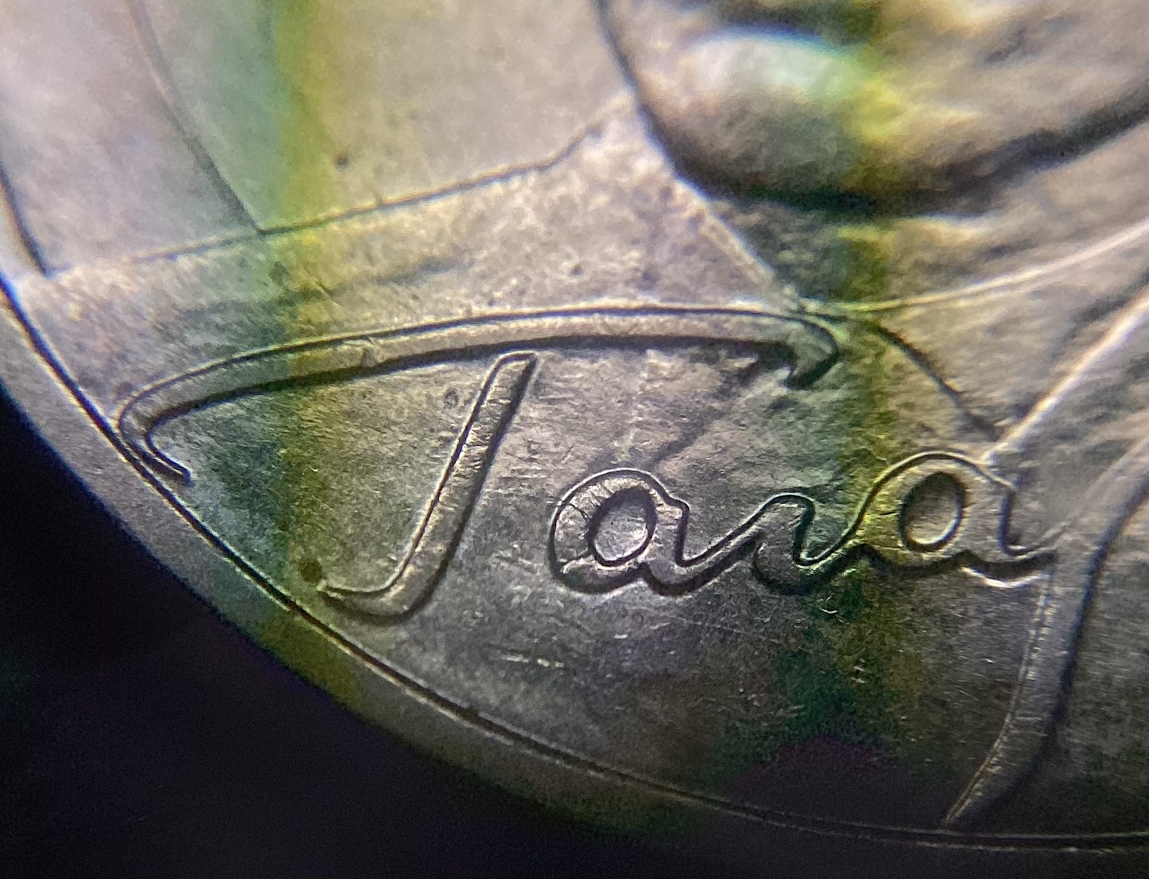 3) линия почти от места соприкосновения плеча с кантом к промежутку между 9 и 6 в дате 1961 (лучше смотреть с рекурса, как на фото)