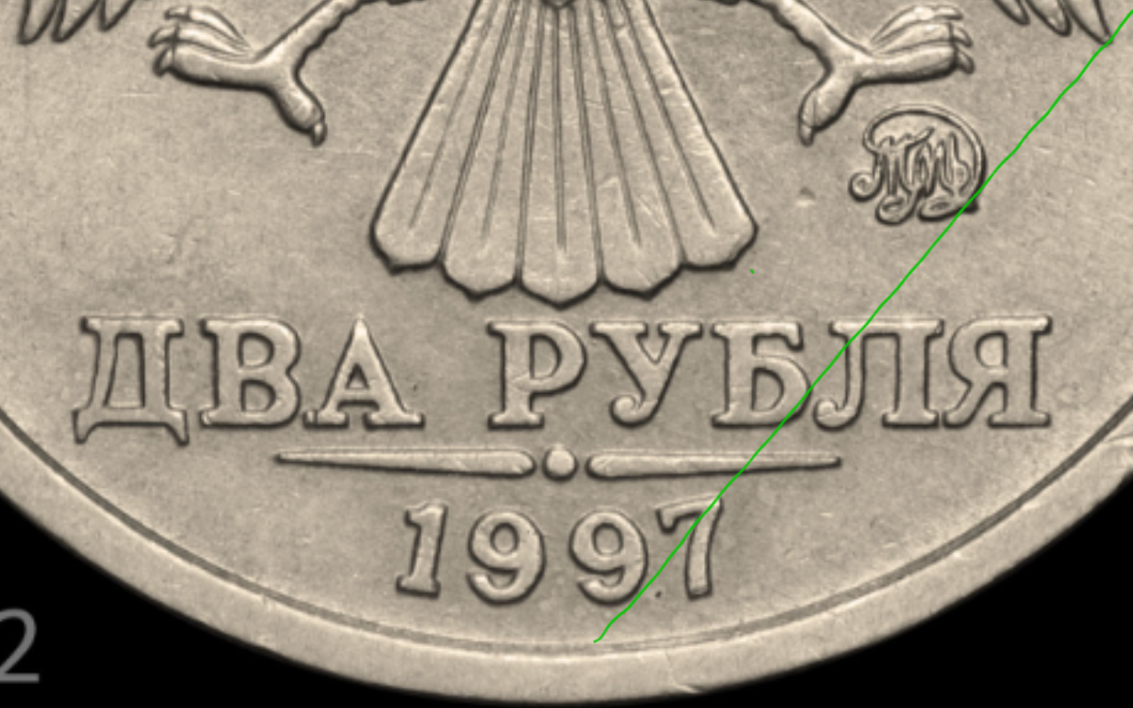 На сдачу попалась в очень хорошем состоянии двушка, на всякий случай решил присмотреться, вроде бы на первый взгляд 1.2А2, т.е. не редкая. Но из-за её хорошего состояния, на всякий случай прочертил линию от крыла по краю знака ММД, и знак оказался вроде-бы смещеным влево по сравнению с расположением знака на аверсе А2 из каталога. Прочерчивал от руки по линейке, погрешность как-бы присутствует, но все же вижу разницу в прохождении прочерченых мною линий.