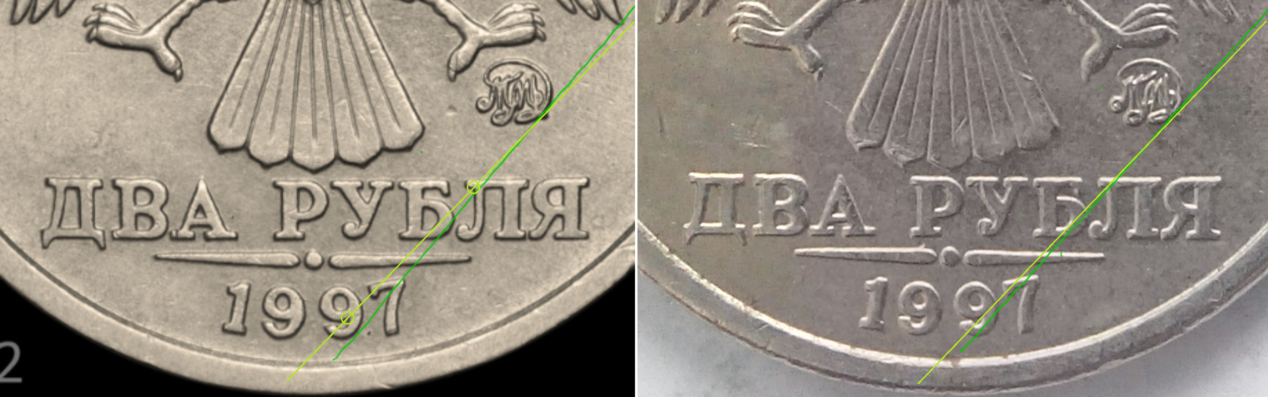 Так чертить линии нельзя, поскольку где реально находится край крыла сильно зависит от состояния штемпеля (высота рельефа, шлифовка и т.д.). По моему опыту довольно надёжно можно использовать точки пересечения всяких элементов изображения (типа того, что я отметил кружками). Вообще в идеале, конечно, брать центры каких-то элеметов, типа точки над девятками. Но у вас вроде и так видно по правильно проведённым линиям, что монета нормальная.