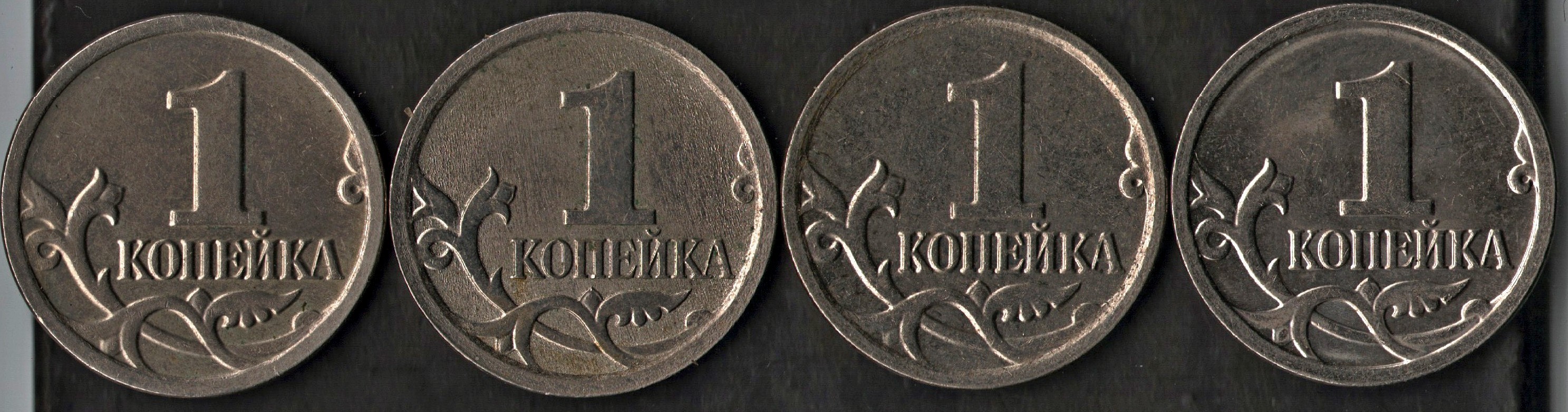 Ниже на изображении групповой скан с монетами шт. 5.4, где 1 монета убитый шт. 5.4, вторая соответственно шт. 5.3, третья монета имеет приближенную к канту букву А , четвертая рядовой шт. 5.4.