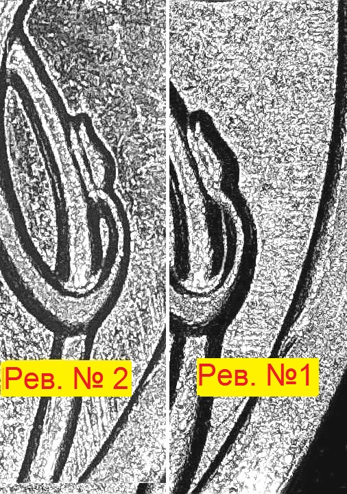 Александр, я решил вернуться к этой теме. Ну никак не могу принять факт, что это одинаковые реверсы шт. Н 4.1 В (3.3). Сделал увеличение деталей с другой монетой этого же штампа. Посмотрите, что получилось.