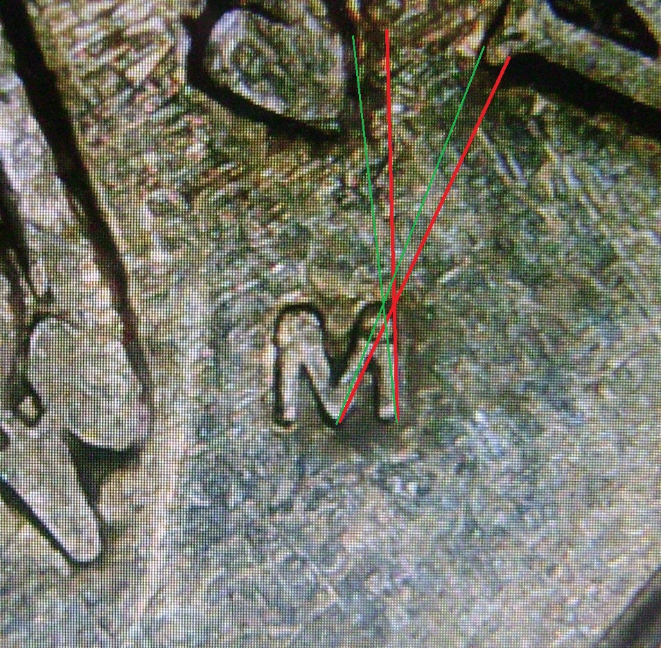 Доброго и с праздником всех.Сделал фото под микроскопом,механика присутствует но удар больше на левую ножку пришелся.Зеленым начертил как на обычной.Красным обсуждаемая начертил примерно выравнивая неровности.Может и неправильно.