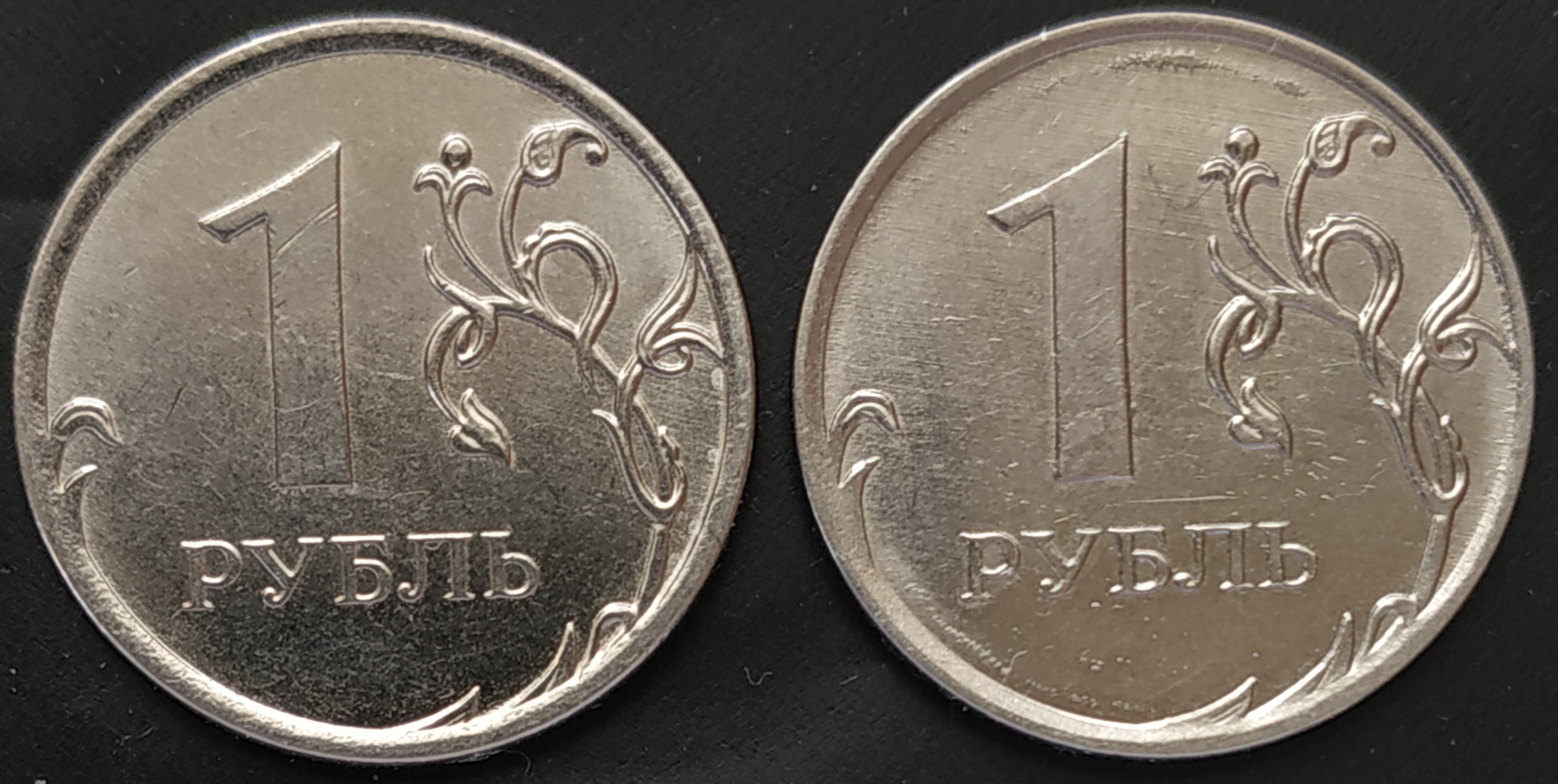 Модель 3. Единица мелкая, шрифт надписи «РУБЛЬ» тонкий. Высота рельефа единицы на одном уровне с орнаментом. Правый лепесток цветка перекрывает левый.