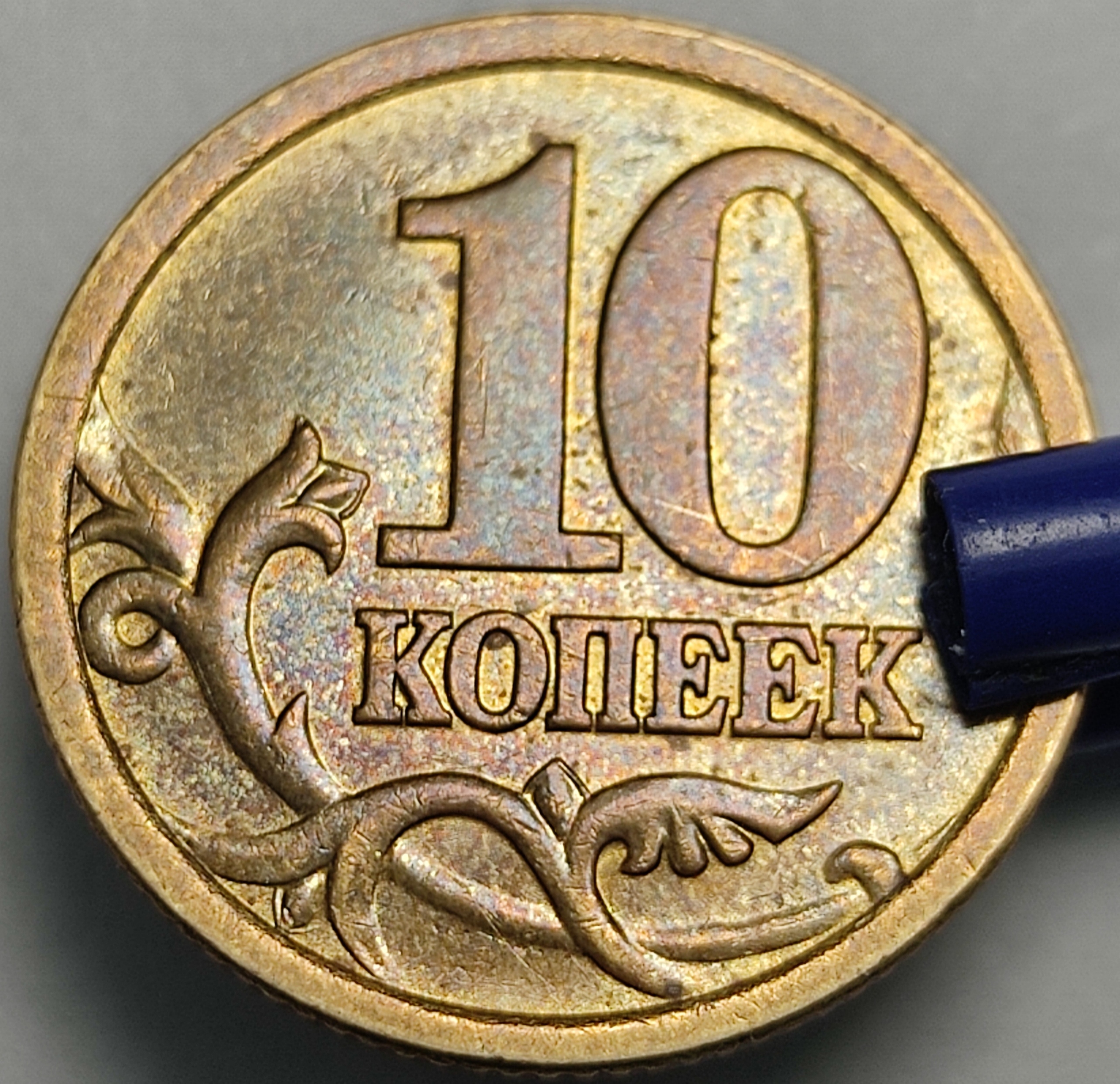 Выставляю на осмотр еще один найденный мной экземпляр 10 копеек 2005 СП 2.31А2 с уменьшенным изображением аверса. Верхний повод четкий и прямой. Монета с небольшим штемпельным блеском.