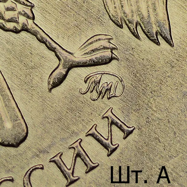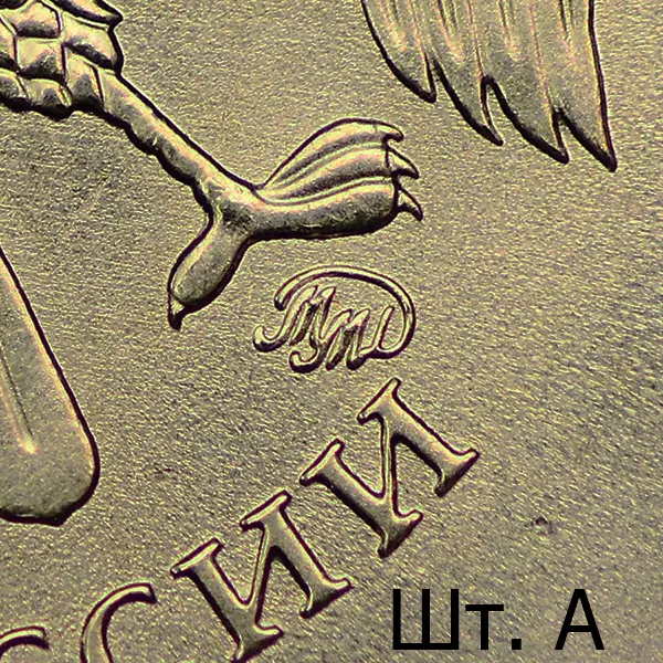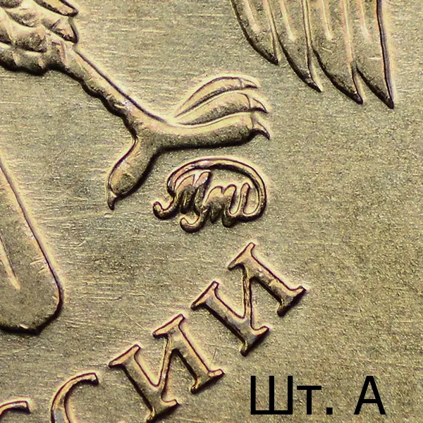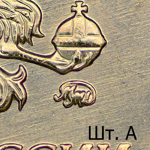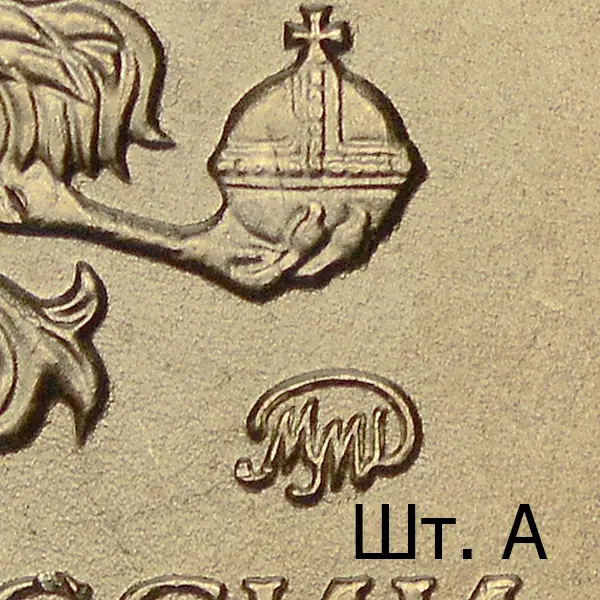 Штемпель А. Знак высокорельефный. Последующие разновидности имеют индивидуальный рабочий штемпель с персональным клеймением пуансоном со знаком ММД. Размеры изображения уменьшены (~ 0.8%), элементы отдалены от канта в сравнении со шт. А.