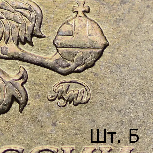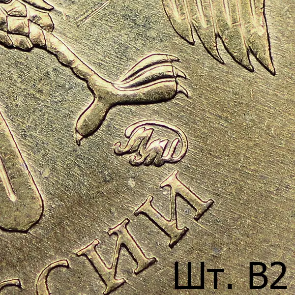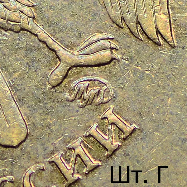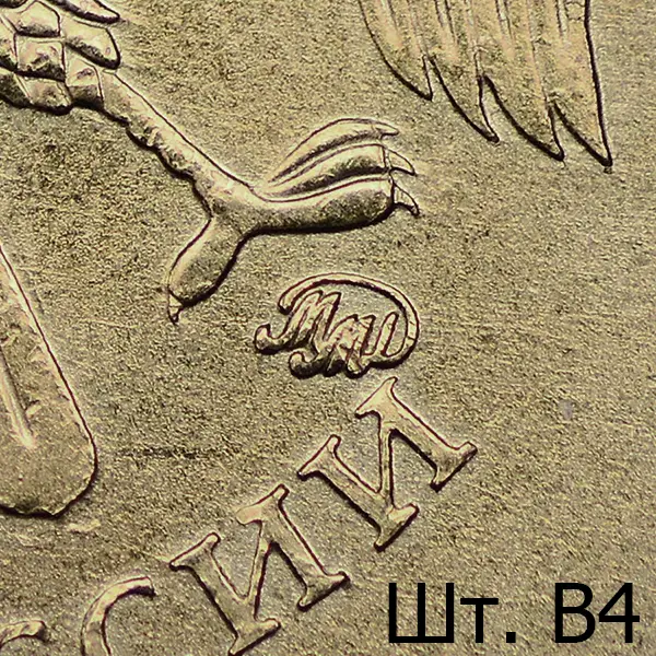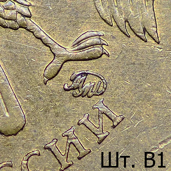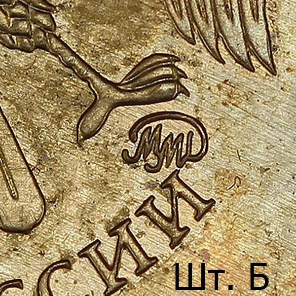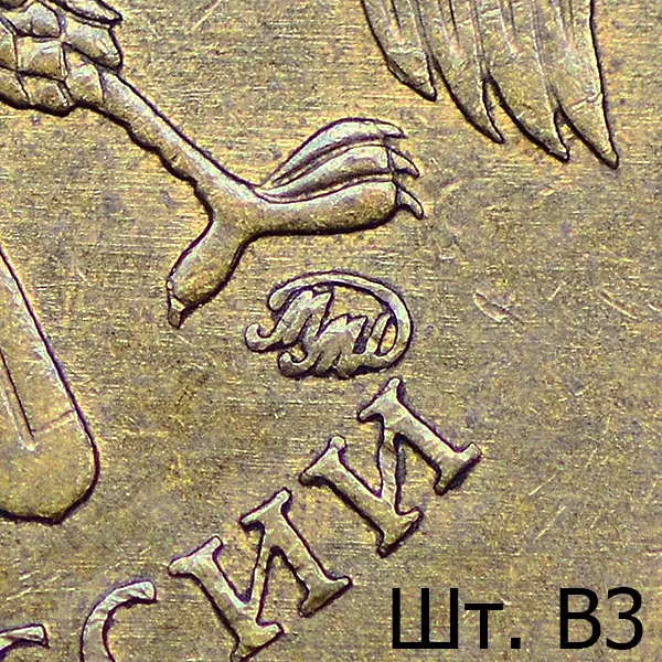 Штемпель В. Знак приподнят и смещён влево, повёрнут по часовой стрелке в сравнении со шт. А. Вплотную приближен к лапе орла.