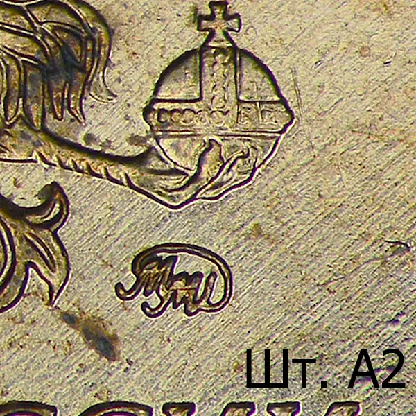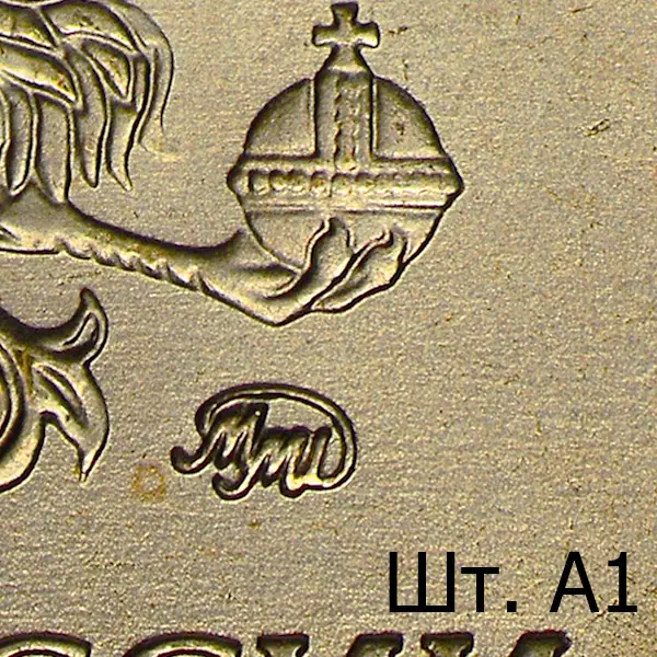 Штемпель А1. Знак приспущен и смещён влево. Последующие разновидности имеют индивидуальный рабочий штемпель с персональным клеймением пуансоном со знаком ММД. Размеры изображения уменьшены (~ 1.2%) в сравнении со шт. А.