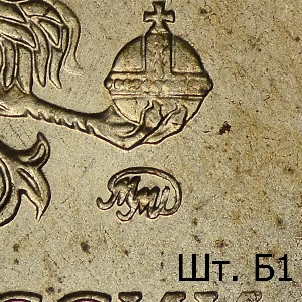 Штемпель Б. Знак иной формы, мелкий и низкорельефный, носик второй буквы М длинный.