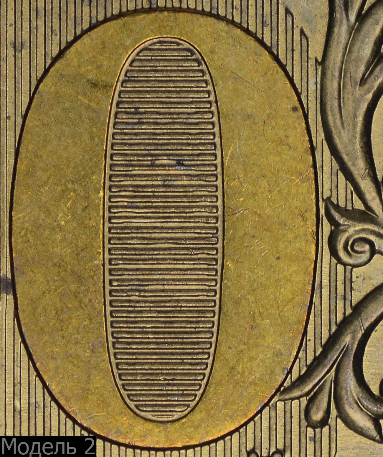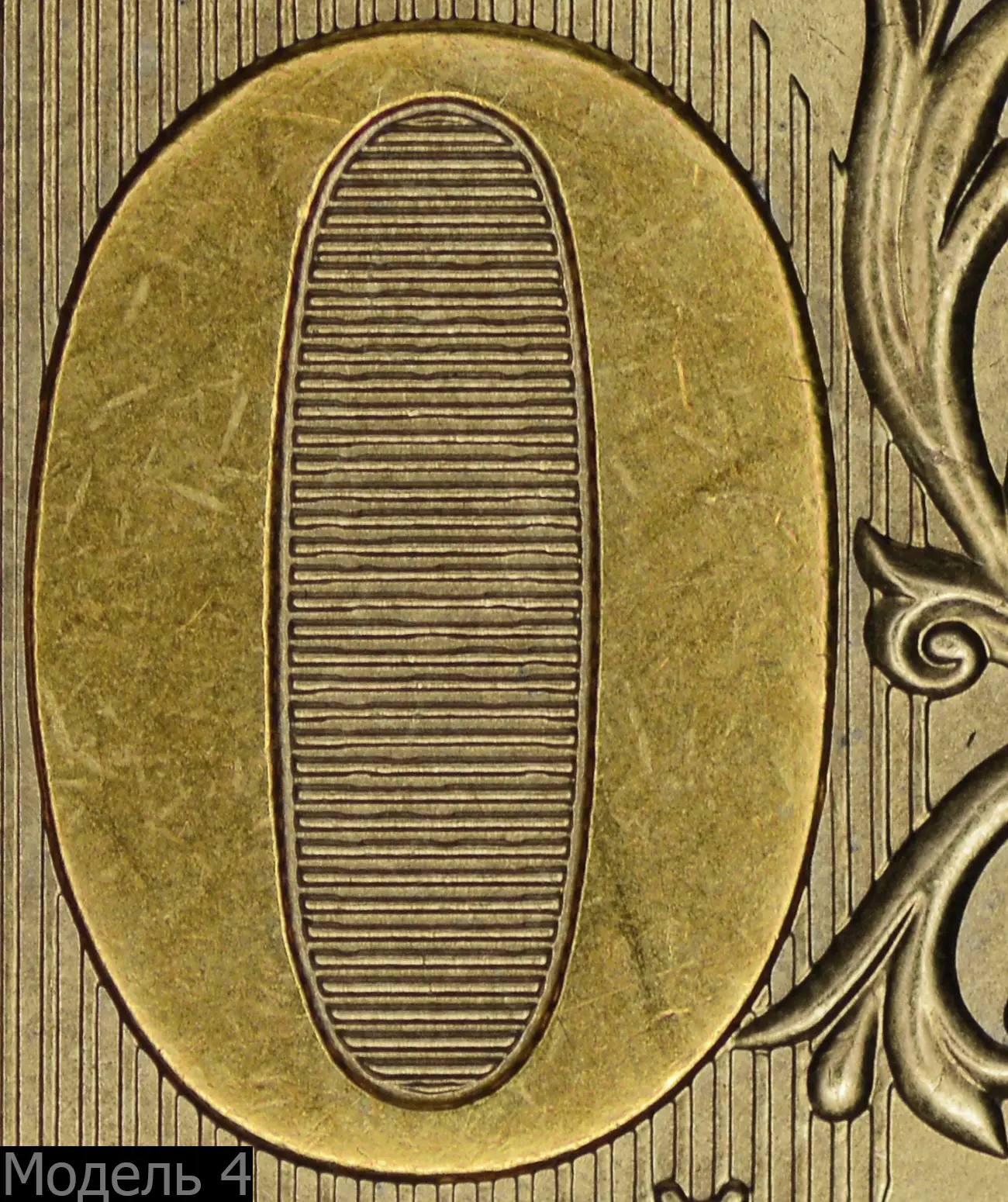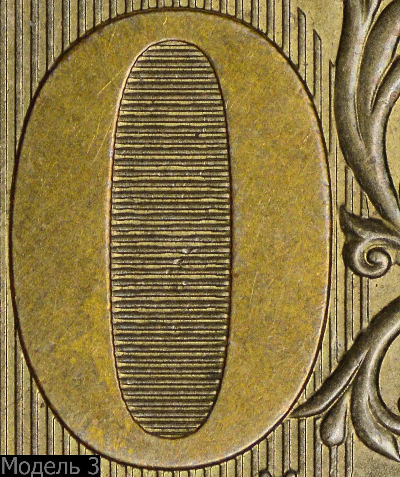 Модель 3 (СПМД). Внутренняя зона нуля очень узкая, защитные линии сливаются с цифрой. Иная проработка деталей ветки орнамента и её сочленение с фоновыми линиями.