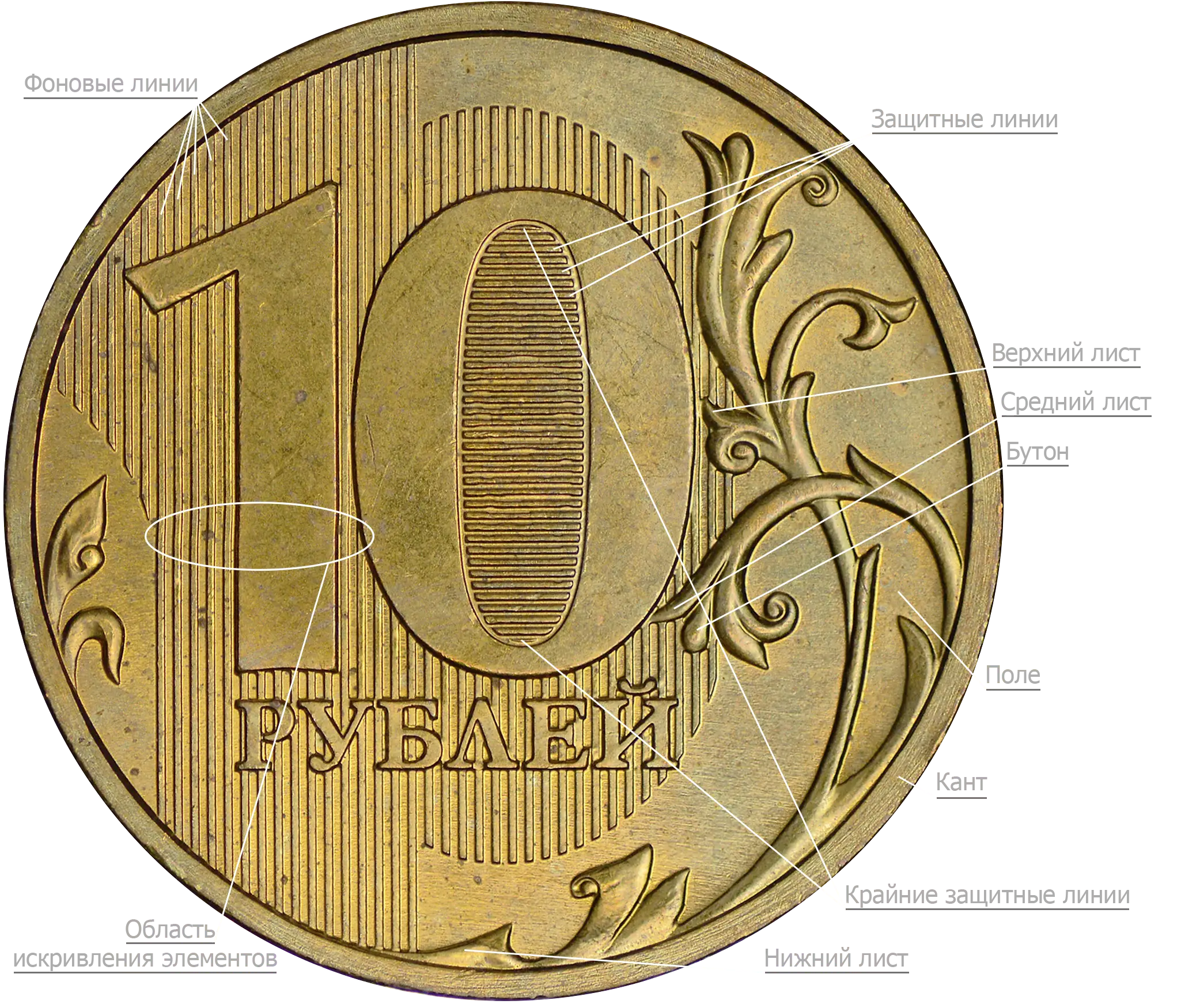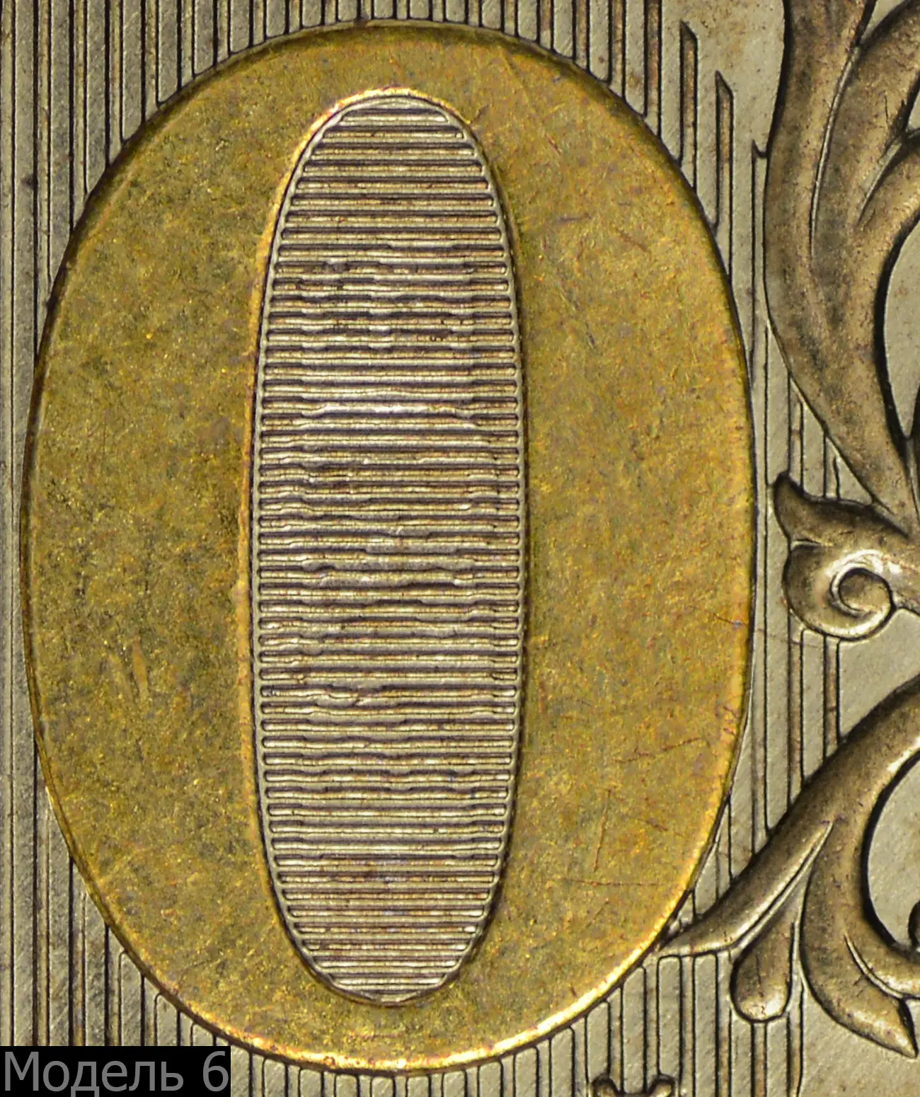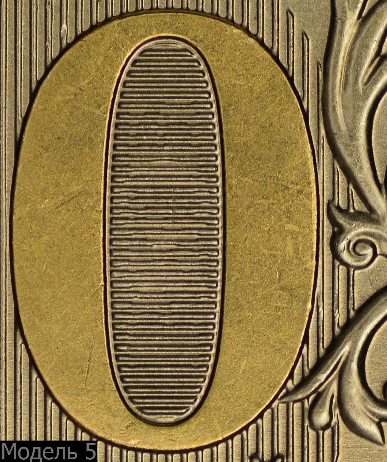 Модель 3 (СПМД). Внутренняя зона нуля очень узкая, защитные линии сливаются с цифрой. Иная проработка деталей ветки орнамента и её сочленение с фоновыми линиями.