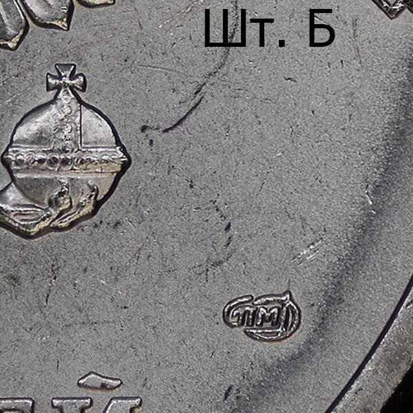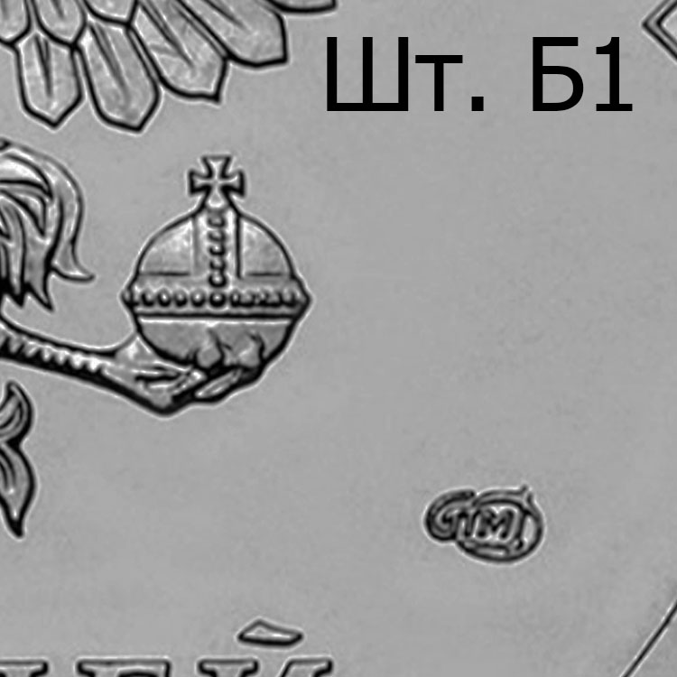 Штемпель Б1 (СПМД). Знак приподнят, последняя насечка на левой лапе приближена к предыдущей. Точки на державе крупные, без окантовки.