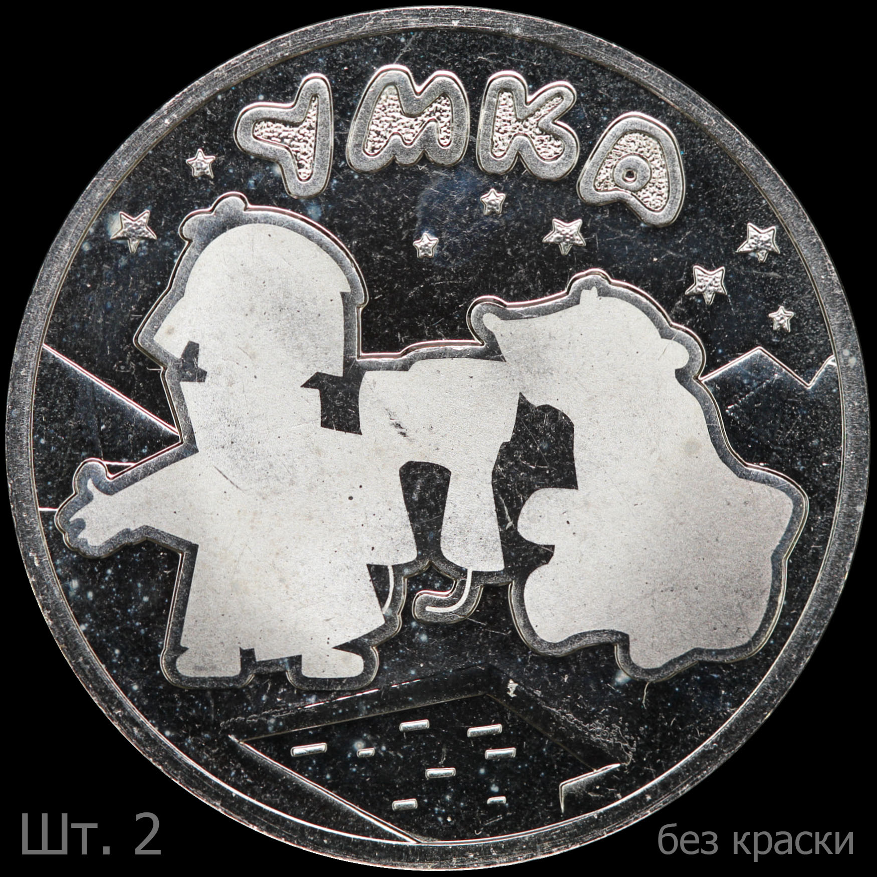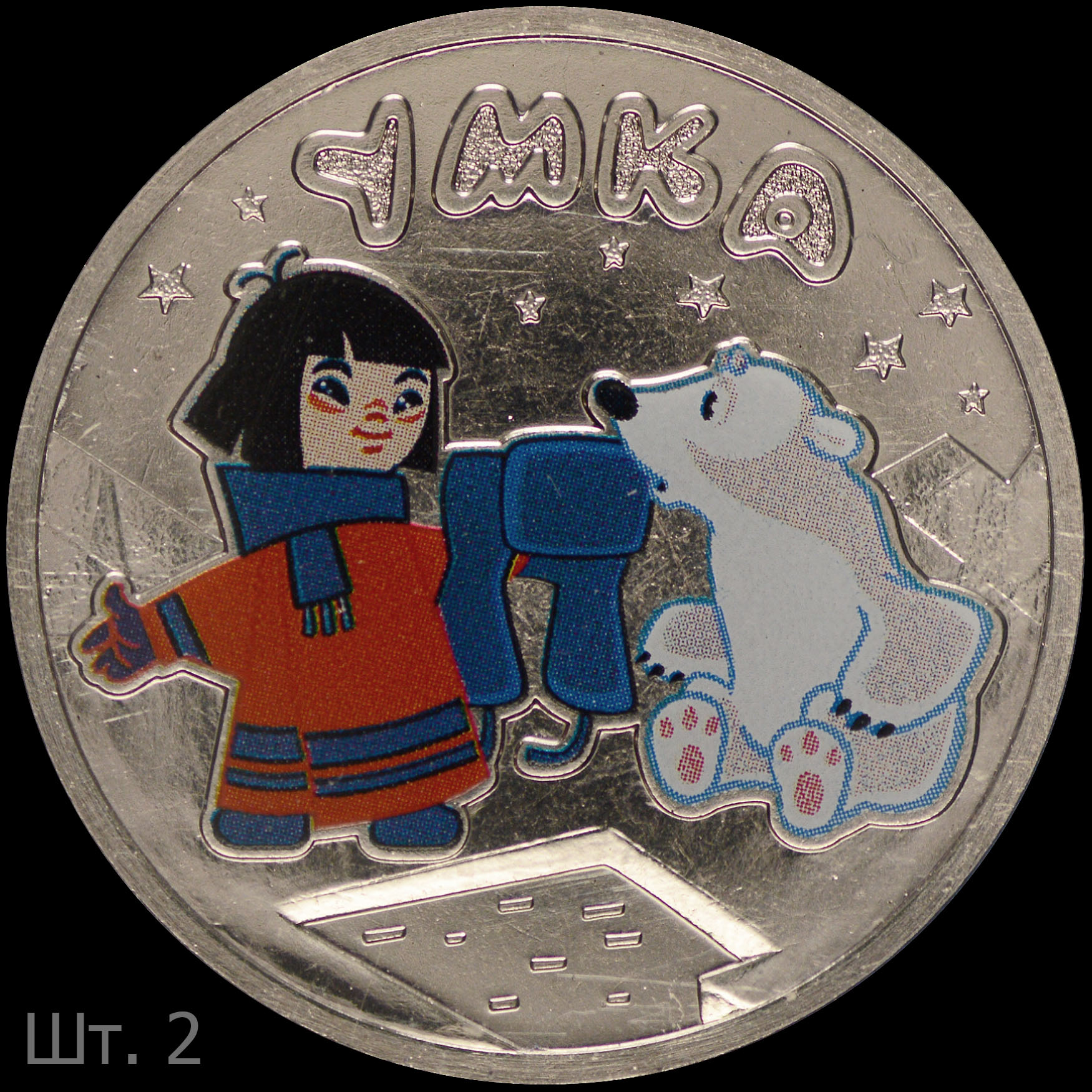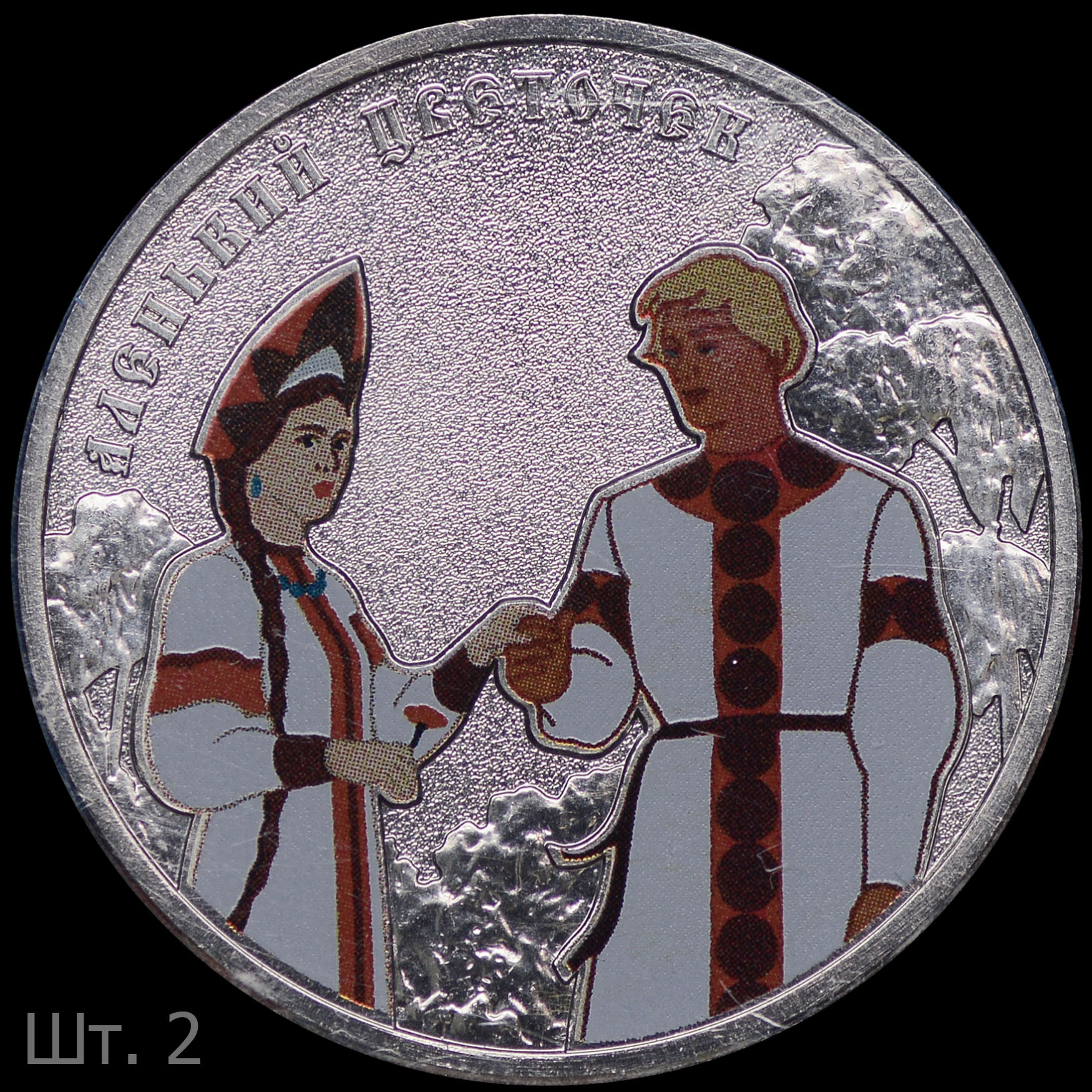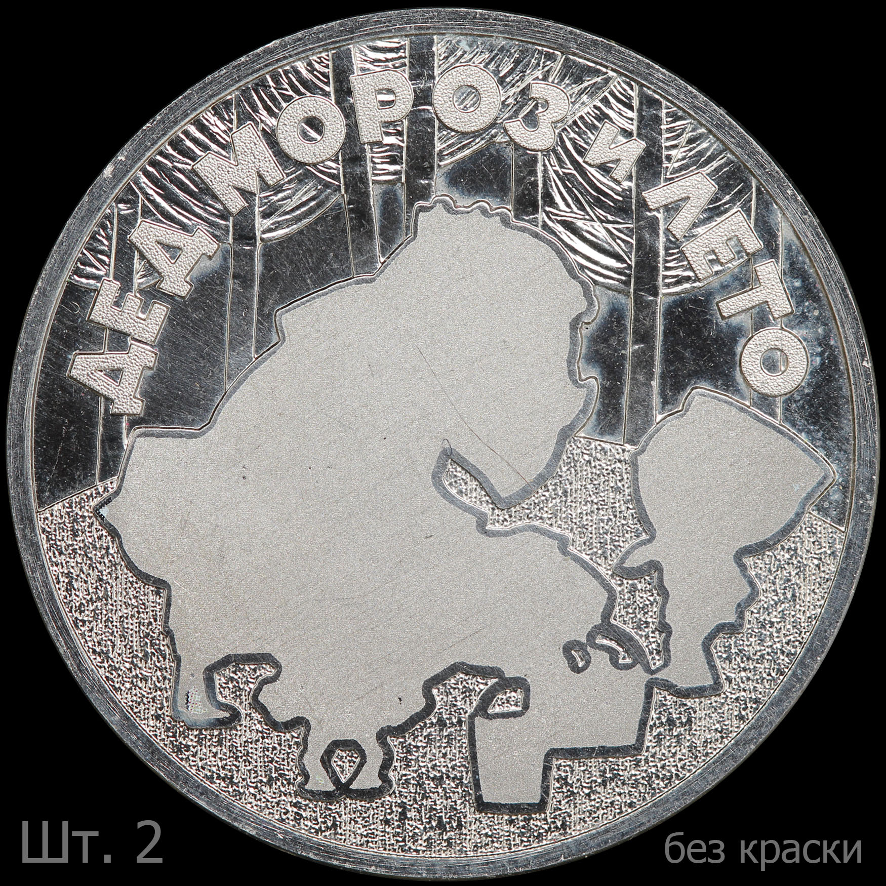 Примечание. Разновидность монеты 2.1Г является образцовым вариантом, в "ообороте" неизвестна. Цветное покрытие на неё наносилось комбинацией из пяти отдельных цветов. На тиражных монетах этого выпуска и далее при тампопечати используется комбинация CMYK цветов.
