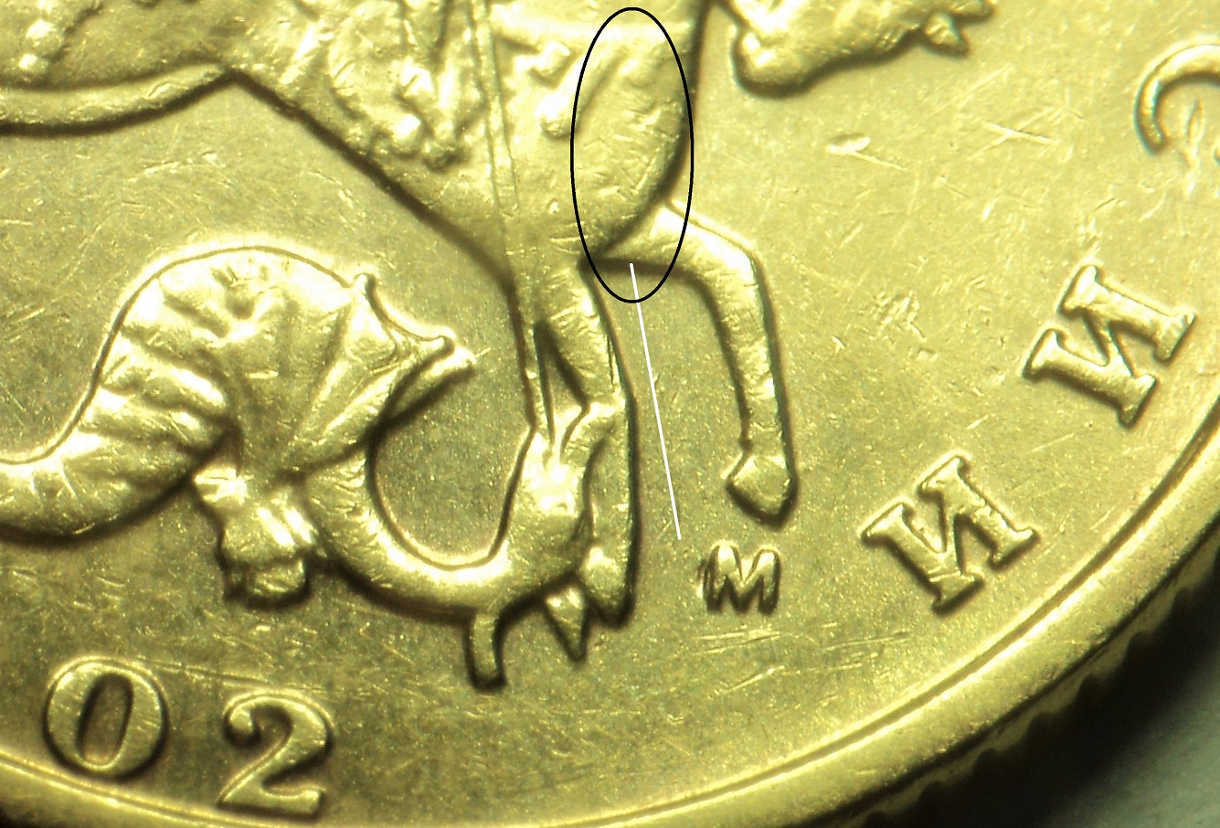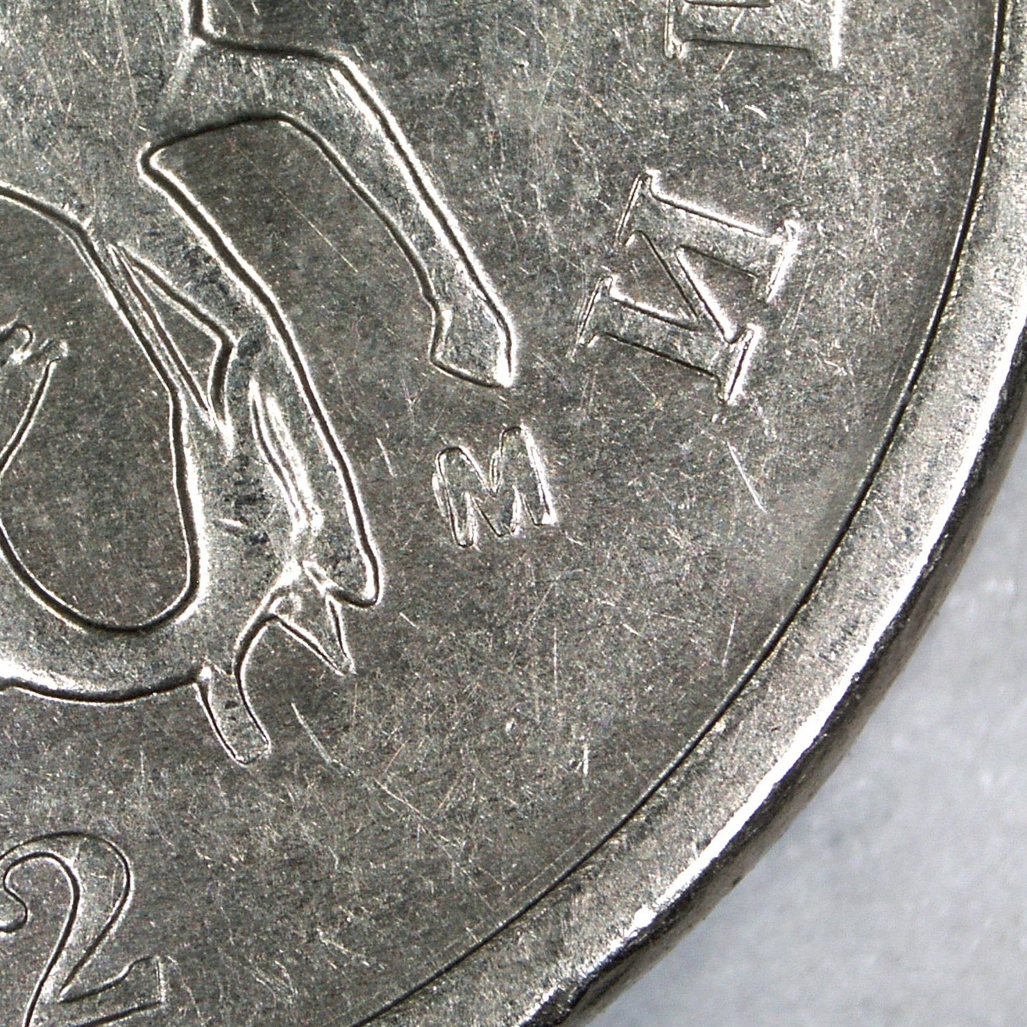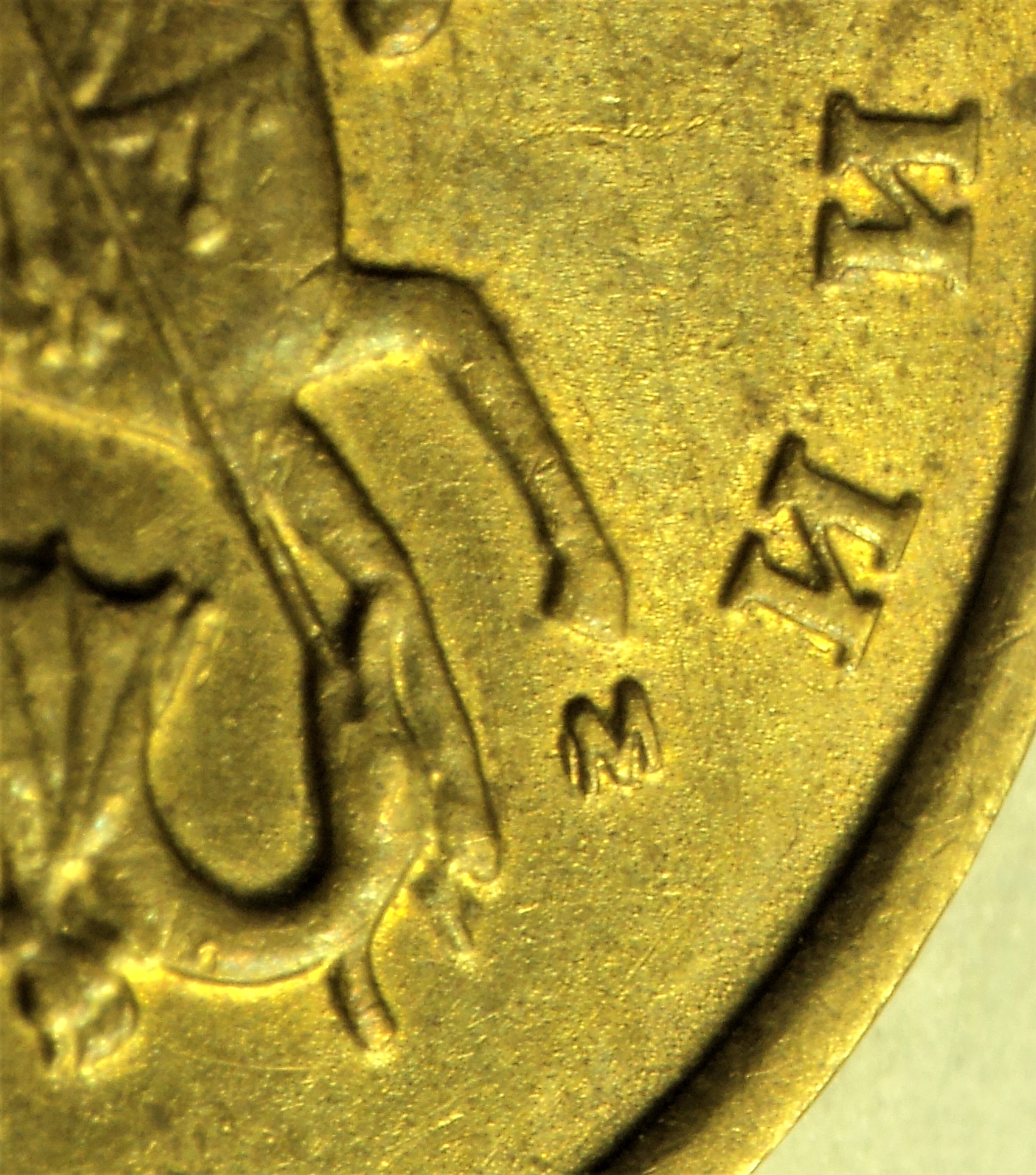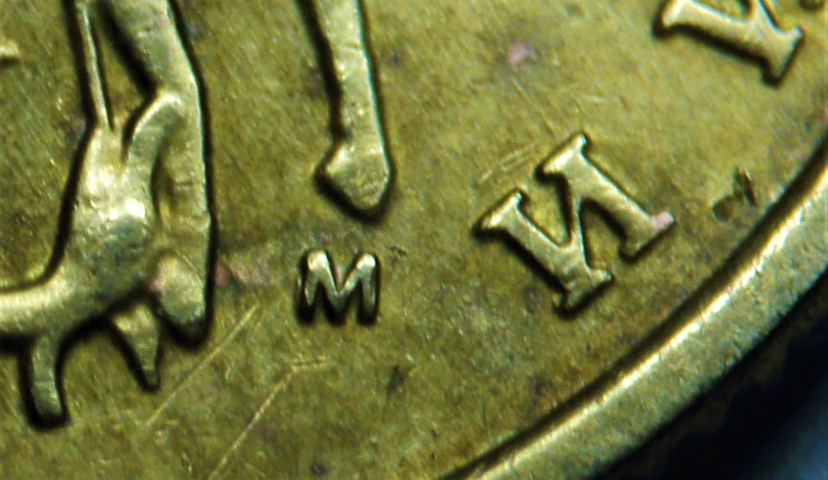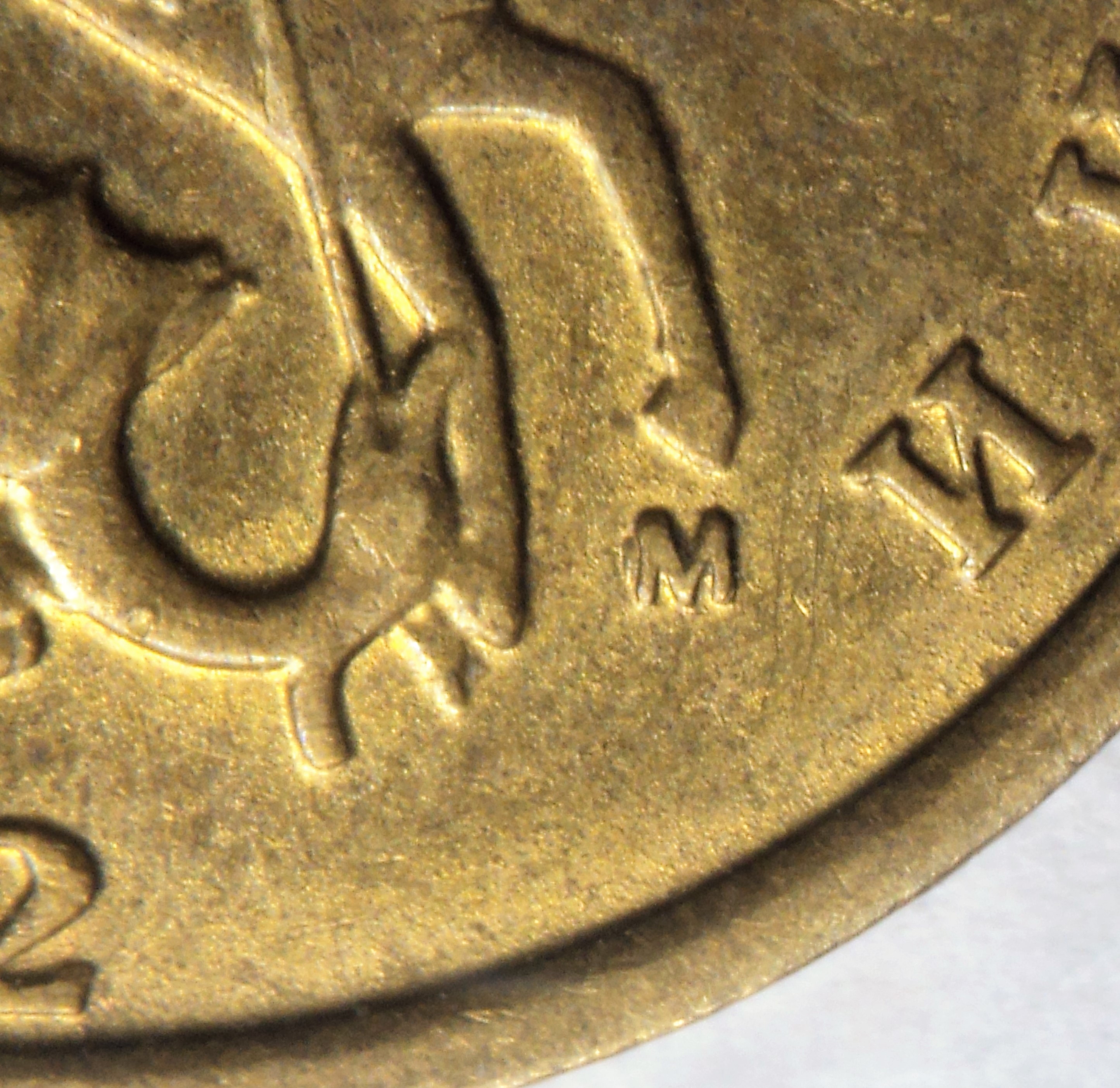 Встретилась вот такая монетка, пока так и не определился, засор ли при копировании, к чему меньше склоняюсь(можно сказать вообще), или небольшой сдвиг маточника(двойной удар) , в этом случае просечка между "каплей" и ножкой буквы "М" как нельзя к месту ,кмк , а сама "капля" , это не затянутый(не заполненный) металлом фрагмент негативного изо. при повторном давлении полем маточника :D