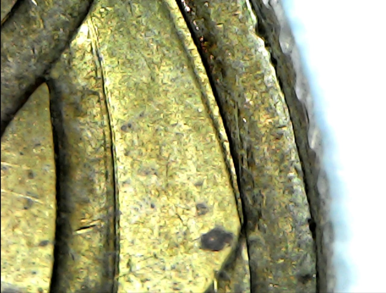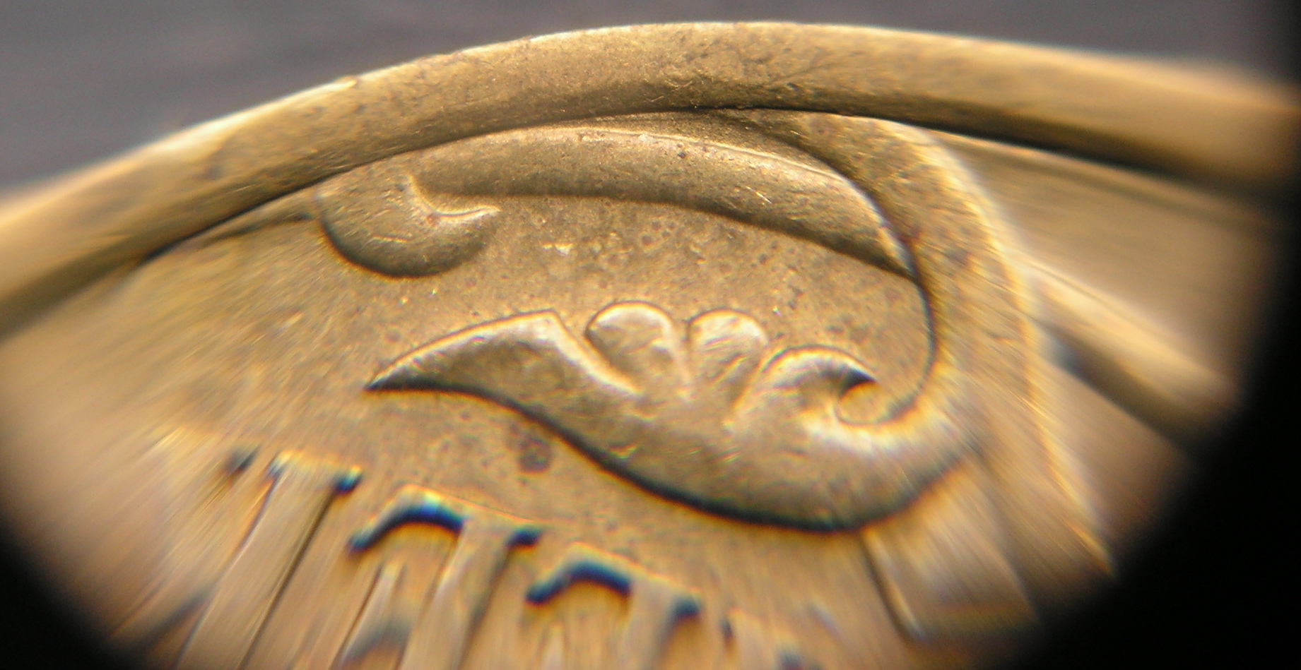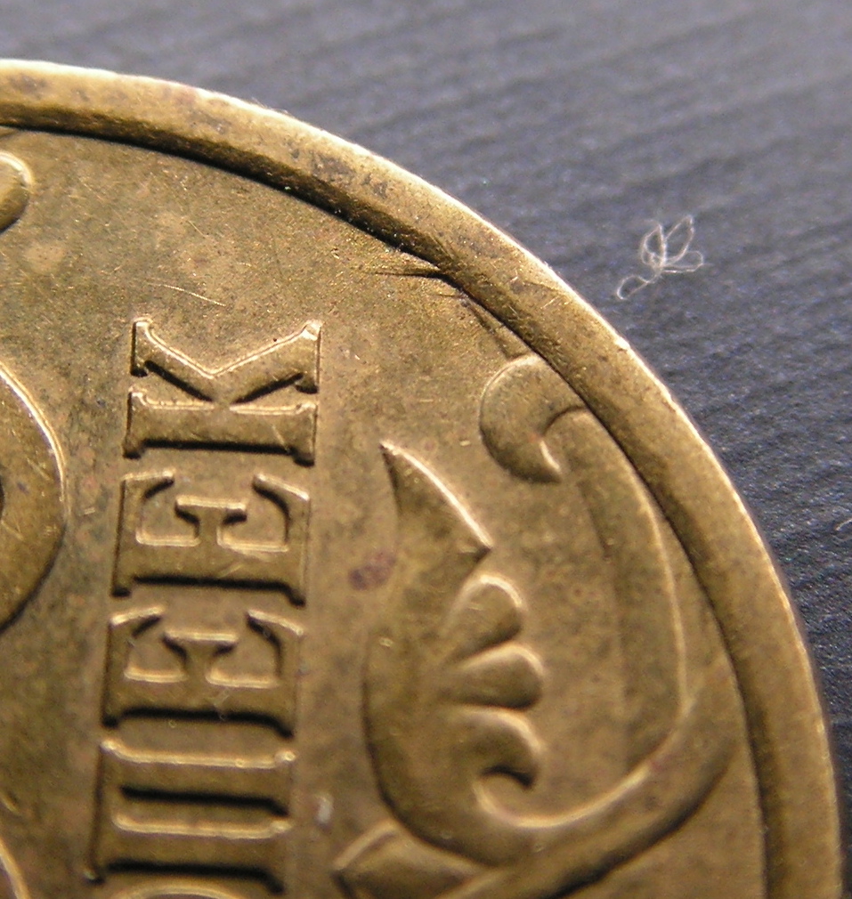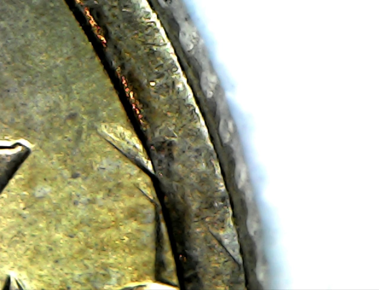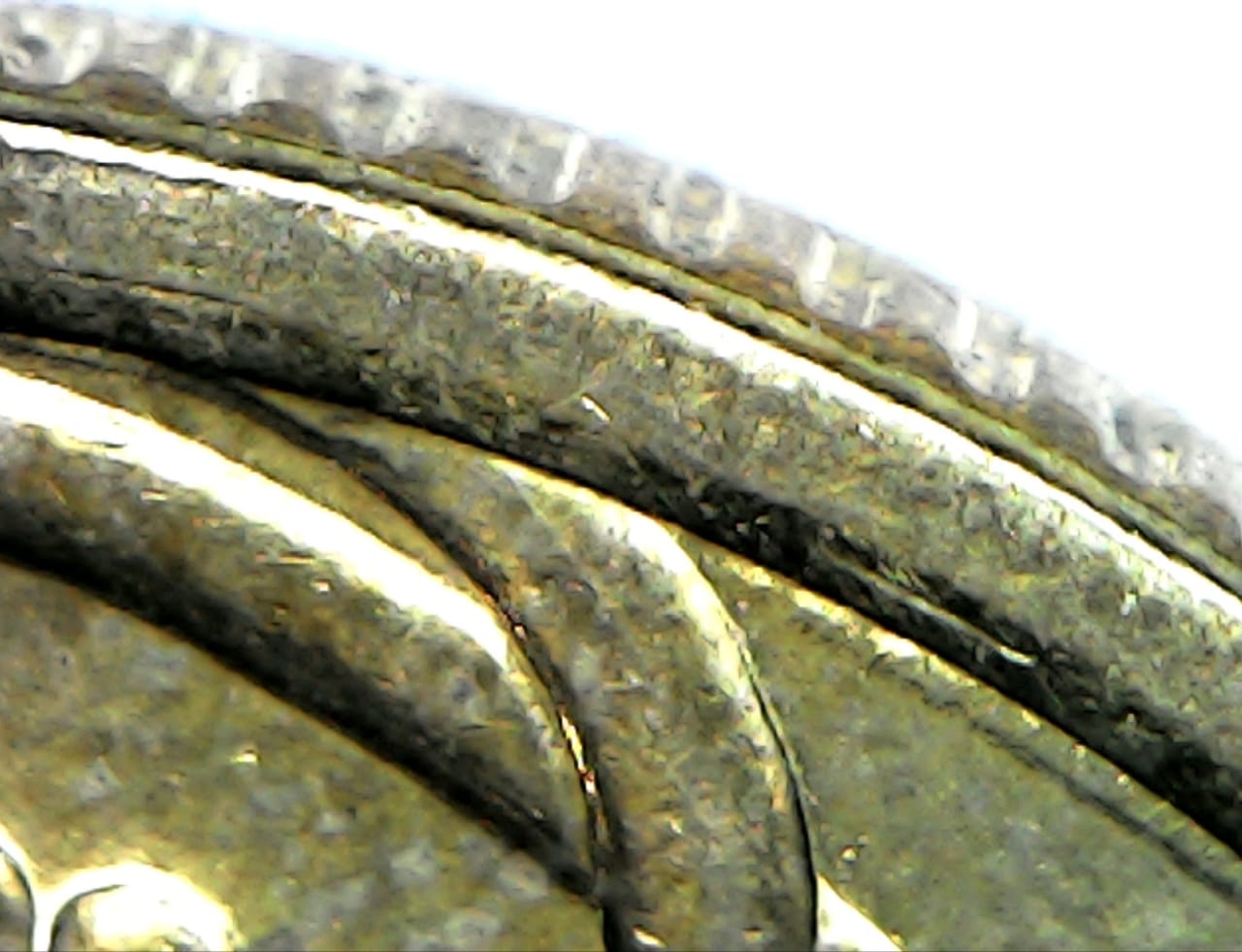 Уже не первый раз попадается такая монета. В этот раз решил сфоткать. Идет выпуклая линия вдоль канта, ее продолжение видно в том "треугольнике", который мы смотрим, когда ищем 2.32, и справа вниз от последней "К" два таких "вертикальных шипа".