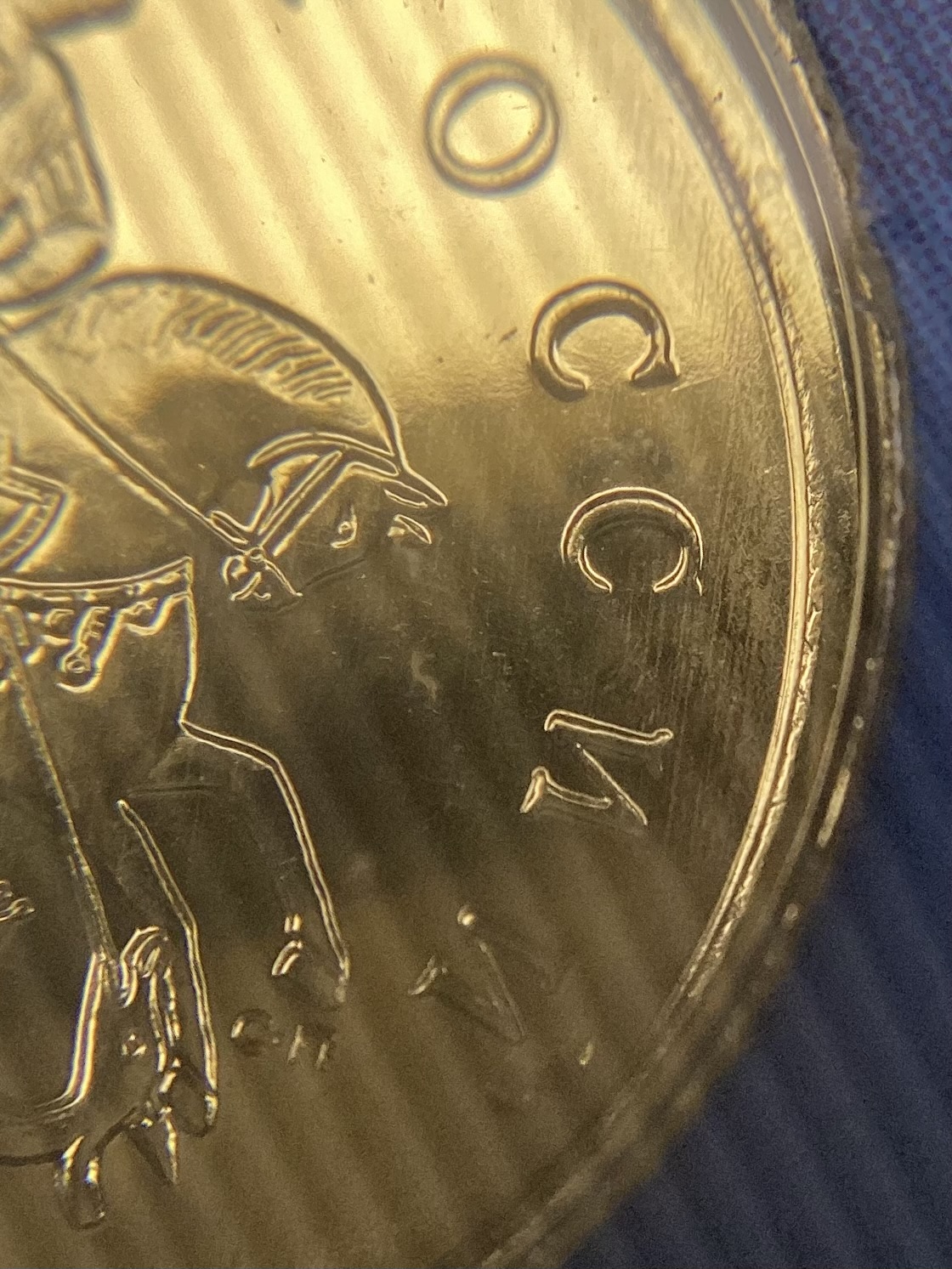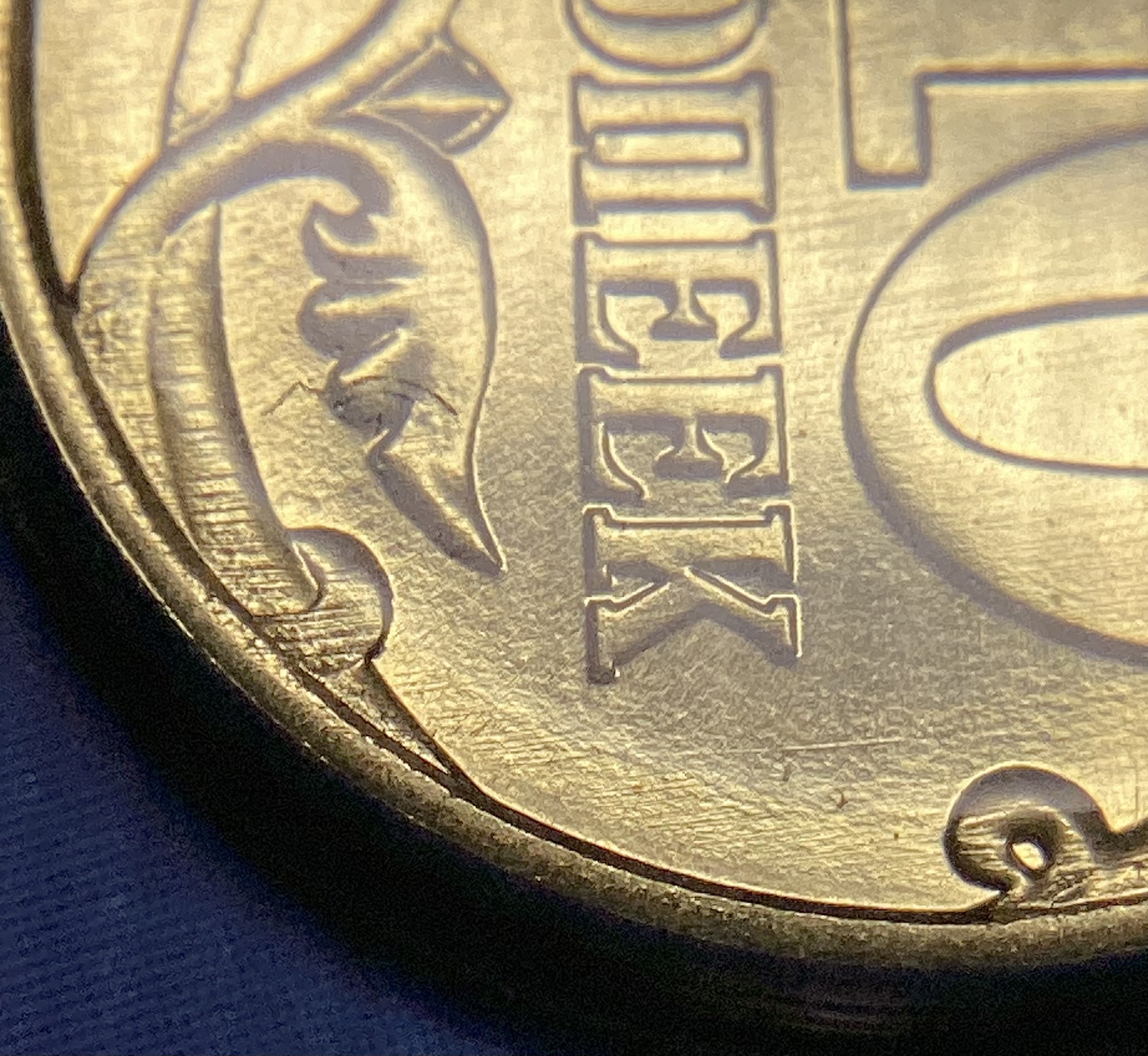 На аверсе ряд мелких линий (фишек) в районе букв СС в слове РОССИИ. И небольшой, но заметный штришок под левой задней ногой лошади.
