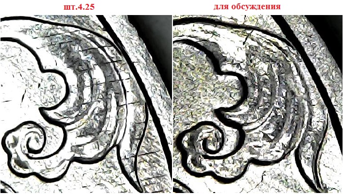 Раньше попадались 2 рубля шт.4.25, а сегодня выловил 2 шт. и вроде вижу шт.4.3, но есть некоторые отличия. В частности, прорезь большого листа ближе к канту, сам изгиб большого листа - от канта до прорези – тоньше, чем у шт.4.25. (см.сравнительные фото фрагментов), ну и буквы, и расположение слова «РУБЛЯ» отличается от шт.4.3 – идентичен со шт. 4.25. Подскажите – возможно, что-то новое или опять качество изготовления? Может что-то использовали из прошлых? Подключайтесь, развейте сомнения.