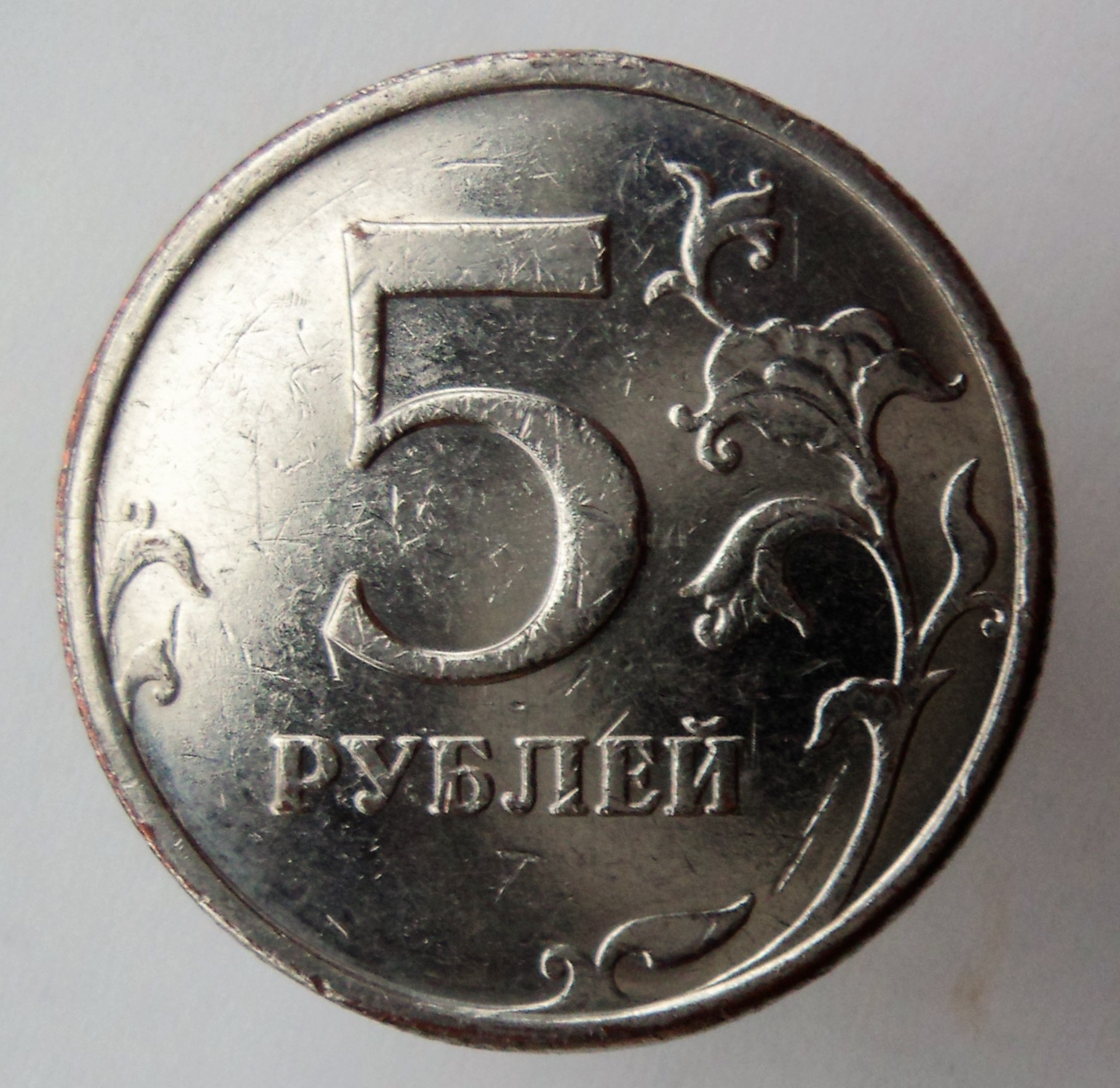 Ну а для тех, кто не только смотрит, но и видит, скину фото фальшака пятёрки. Здесь виден ряд признаков, которые не могут появиться на ММД. Не говоря уж об идентичных механических повреждениях, снятых с оригинальной монетки.