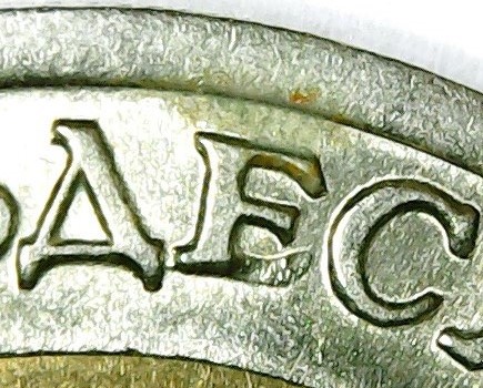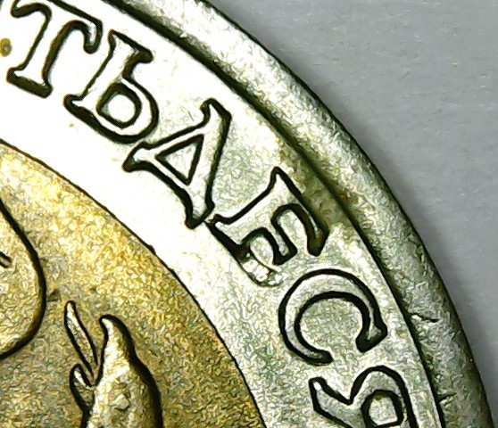 На Реверсе другой монеты, на внутренней вставке, знак монетного двора сильно смещен вниз, по сравнению с знаками мон.двора монет Каталога, до примыкания к внешнему медно-никелевому кольцу. Может это произошло от сильного смещения вниз внутреннего латунного диска ? . На Аверсе данной монеты, у буквы Й имеется небольшой участок - след раскола штемпеля.