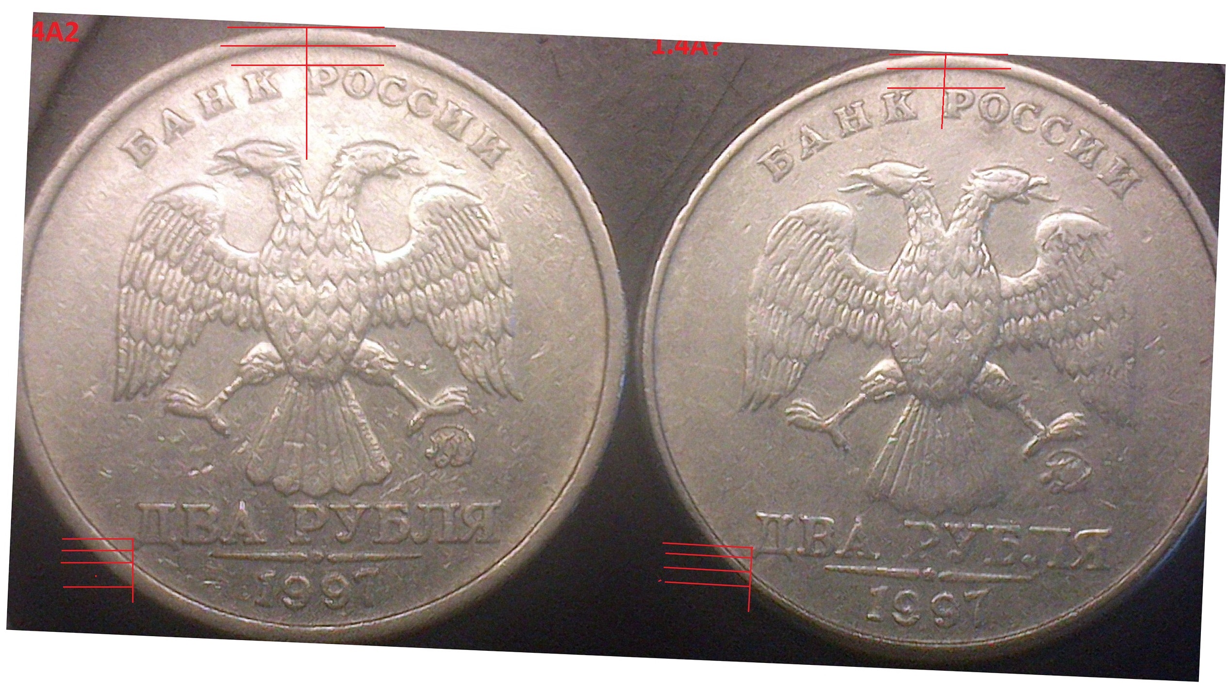 Так же фото,найденной 1.4А1,в сравнении с аверсом шт.Бtimon1986 писал(а): ↑29 июл 2021, 22:00:53На самом деле,я давно уже нашёл сочетание шт.1.4А1!!!Ну не могут у нас "знатоки " нумизматики,увидеть ЯВНЫЕ признаки аверса А1!Когда свою выставлял на обсуждение,специально,только аверс показал,спросил какой вариант...Все в один голос ответили:-А1!!!После показал реверс,и началось....То это не то,то это не так)))Вот моё фото аверса ,в сравнении с А2(слева),(справа),А1,в сочетании реверса 1.4.