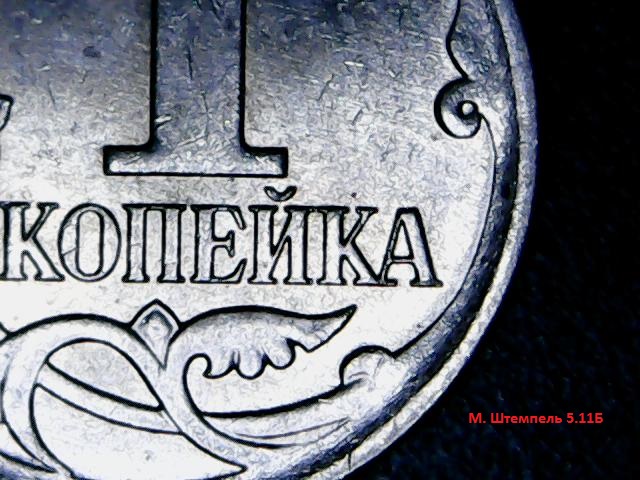 В 2010 году приобрел 80 монет, позиционированных как 1 копейка 2007 года М шт.5.4 Б. Чуть позже купил 15 монет, подававшихся как 1 копейка 2007 года М шт.5.11 Б. Стоимость монет шт.5.4 Б была в 8 раз ниже, нежели монеты шт.5.11 Б. Еще чуть позже приобрел электронный микроскоп, при использовании которого возникли сомнения в отнесении части монет к шт. 5.11 Б. Вот выкладываю для обсуждения ситуации сканы образцов монет, обозначенных как шт.шт.5.4 Б и 5.11 Б. Спорная монета, первоначально обозначенная как шт.5.11 Б, отсканирована отдельно для сравнения. В нашем регионе шт.5.11 Б найти весьма сложно, поэтому если у кого есть эти монеты, предлагаю обмен на любые проблемные (если у меня они будут в наличии).