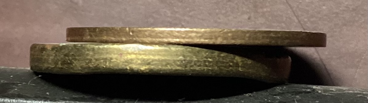 А заготовка теперь показывает 4.31 ( возможно батарейка садится), да и заготовка с виду чуть-чуть потёрта. И ещё она буквально чуть - чуть меньше в диаметре. Видимо после штамповки заготовка раздаётся до нормальных размеров жетона. По толщине на глаз различия не вижу.
