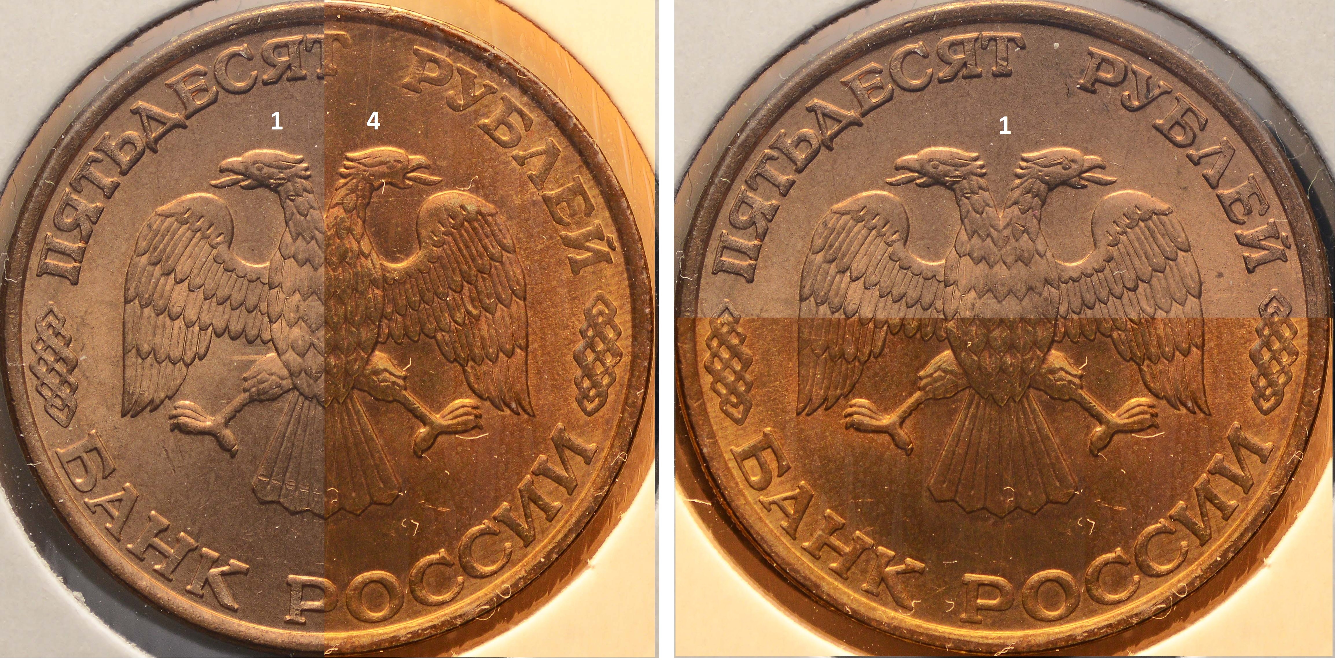 Во-вторых, даже на Ваших сканах плавное увеличение размеров изображения наблюдается только в вертикальном направлении, а в горизонтальном направлении все четыре монеты имеют практически одинаковые размеры изображения. Это хорошо видно при совмещении двух половинок разных монет друг с другом (см. приложенные файлы с попарным сравнением Вашей четвёртой монеты с первыми тремя). Не может же так быть, чтобы штемпели в процессе чеканки "разбухали" только в одном направлении.