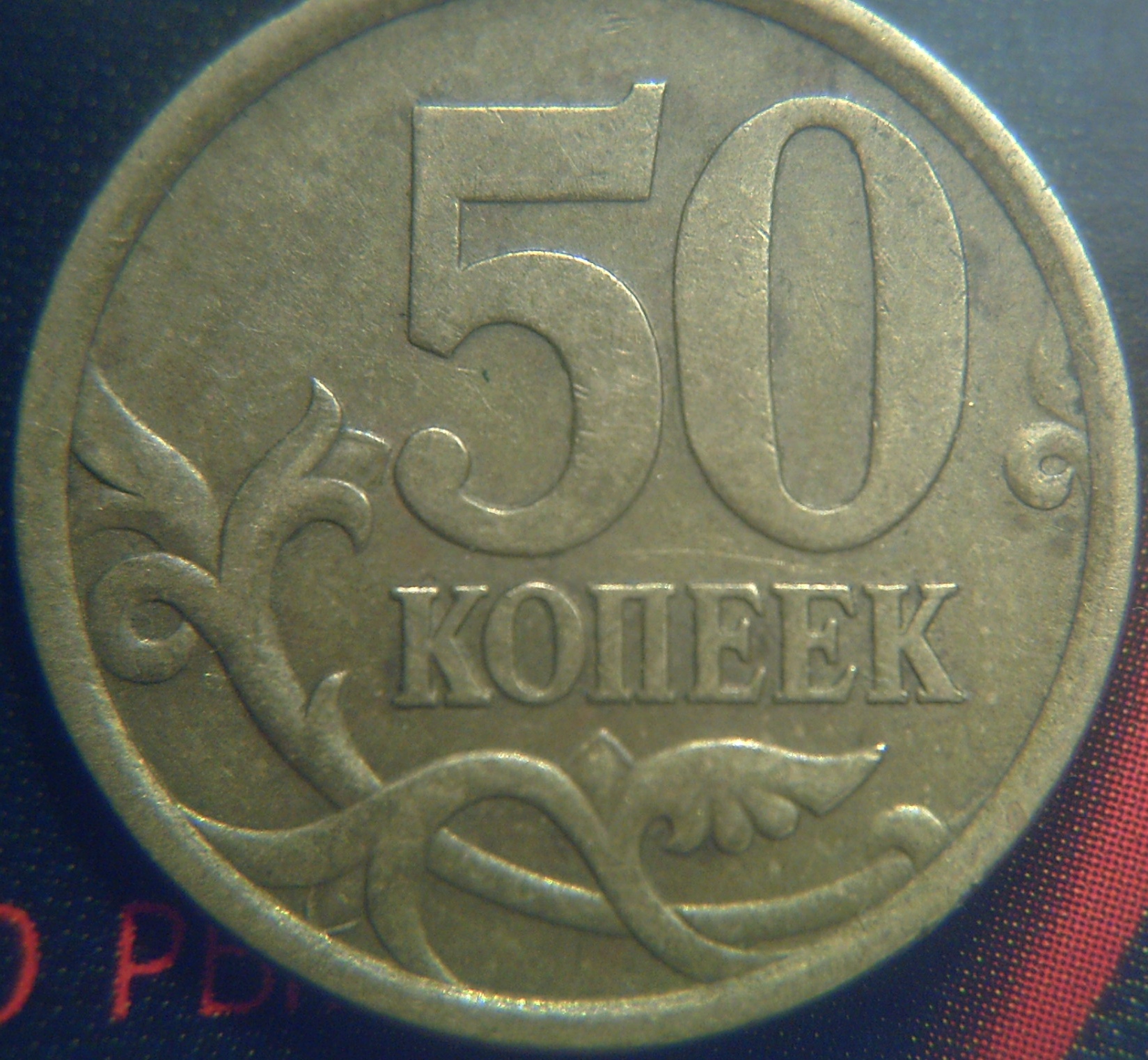 Добрый вечер, господа. Заглянул на форум на минуточку и совсем запутался. Извините за немытую монету и плохое качество. 50 копеек 2005 сп шт. 2.32Х , аверс А. Элементы рисунка отдалены (?) от канта - стебель завитка на 3 часа заходит за кант ниже нижней границы завитка, расстояние между буквами "ПЕ" увеличено, стебли, выходящие из канта - не параллельны. Может, я где ошибся? С уважением.