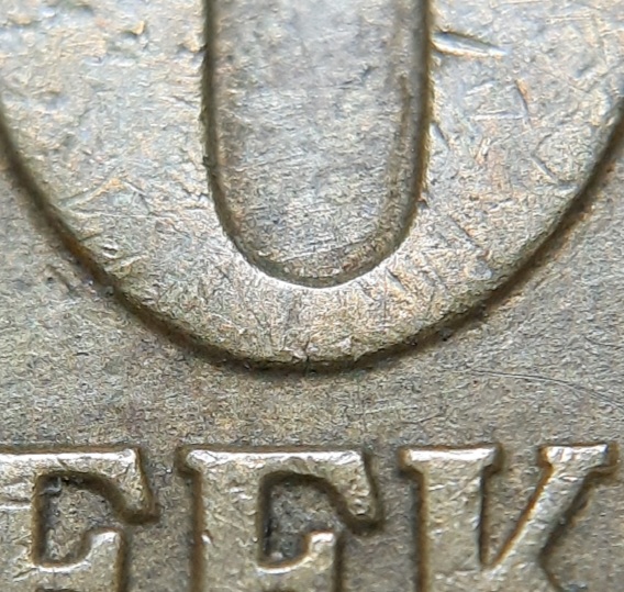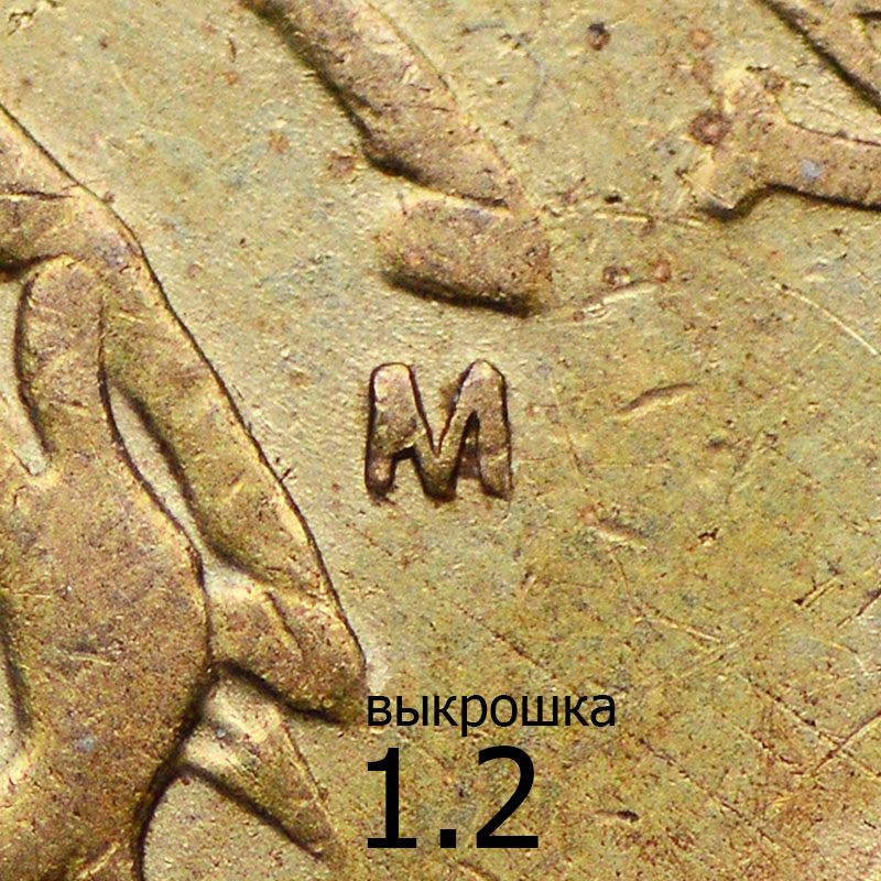 Один из рабочих штемпелей аверса гравировки 1.2 попадается с выкрошкой: